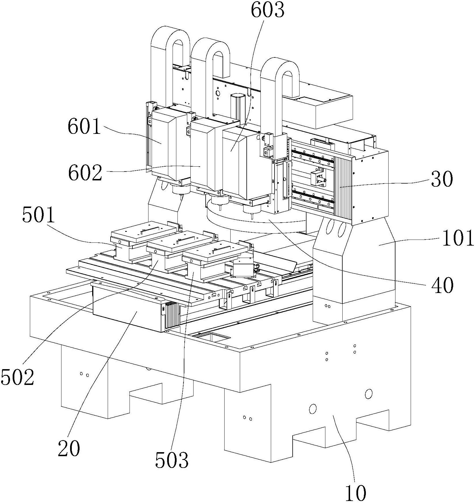 本实用新型公开了一种多主轴自动换刀装置,涉及数控机床技术领域;包括基座、Y轴工作台、X轴运动模组、Z轴主轴加工组件、刀库以及Z轴定位治具;Y轴工作台位于基座上,Z轴定位治具包括Z1轴定位治具、Z2轴定位治具以及Z3轴定位治具,且Z1轴定位治具、Z2轴定位治具以及Z3轴定位治具并排沿X轴方向设置在Y轴工作台上;X轴运动模组设置于基座后端,Z轴主轴加工组件包括Z1主轴加工组件、Z2主轴加工组件以及Z3主轴加工组件;刀库设置在X轴运动模组下方位置;本实用新型的有益效果是:能实现自动换刀,便于自动化控制,工人维护修理,大大降低工人的劳动强度及有效的提高了生产效率。