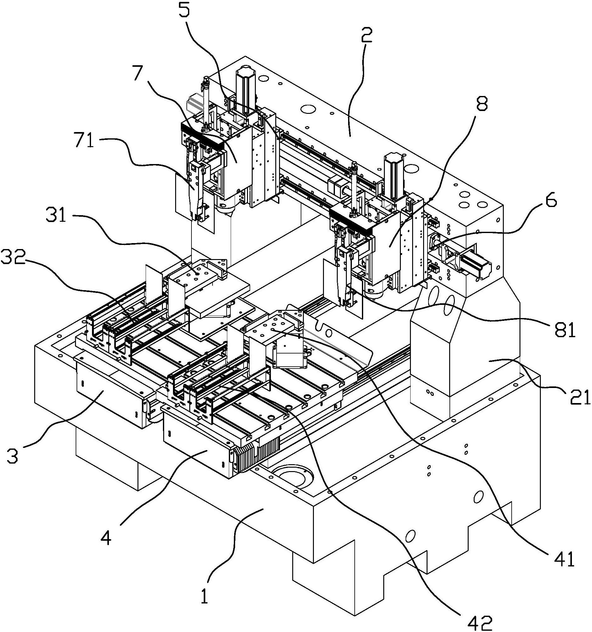 本实用新型公开了一种高精度自动上下料双头精雕机,包括大理石底座和设置在所述大理石底座上的大理石横梁,所述大理石底座上设置有相互独立的第一Y轴工作台组件和第二Y轴工作台组件,所述第一Y轴工作台上安装有第一定位治具和第一取放料架,所述第二Y轴工作台上安装有第二定位治具和第二取放料架,所述大理石横梁上设置有第一X轴组件和第二X轴组件,所述第一X轴组件和第二X轴组件上分别安装有第一Z轴组件和第二Z轴组件,所述第一Z轴组件和第二Z轴组件分别安装有第一机械手组件和第二机械手组件。该种高精度自动上下料双头精雕机具有加工效率高、加工精度高、产品的良品率高、人力成本低、生产自动化程度高等现有技术所不具备的优点。