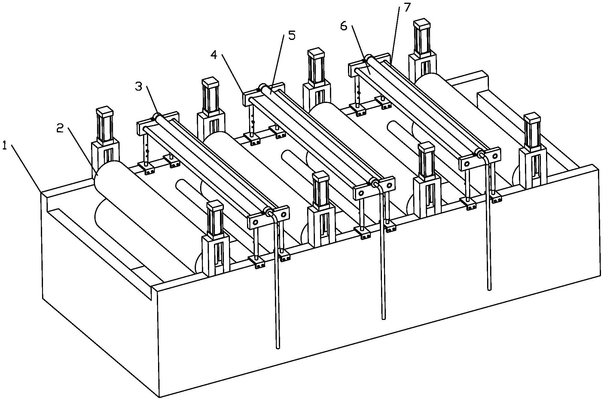 本实用新型涉及一种水洗过滤装置,包括水洗池、挤压滚筒,水洗池上方间隔布置有若干组挤压滚筒,挤压滚筒转动设置于水洗池上方,挤压滚筒之间设置有喷淋装置,喷淋装置包括支撑架、喷淋管,支撑架对称设置于水洗池两边,支撑架包括底座、支撑杆、支撑板,底座设置为倒U型,底座倒U型的两侧设有第一螺纹孔和与之匹配的第一固定件,底座通过第一固定件固定于水洗池的边缘,支撑杆下端与底座固定连接,支撑杆上端与支撑板固定连接,喷淋管一端封闭,另一端与水管连接,喷淋管固定设置于支撑板上。本实用新型旨在提供一种结构简单,既能方便移动和拆卸,又能实现较好的喷淋效果的水洗过滤装置。