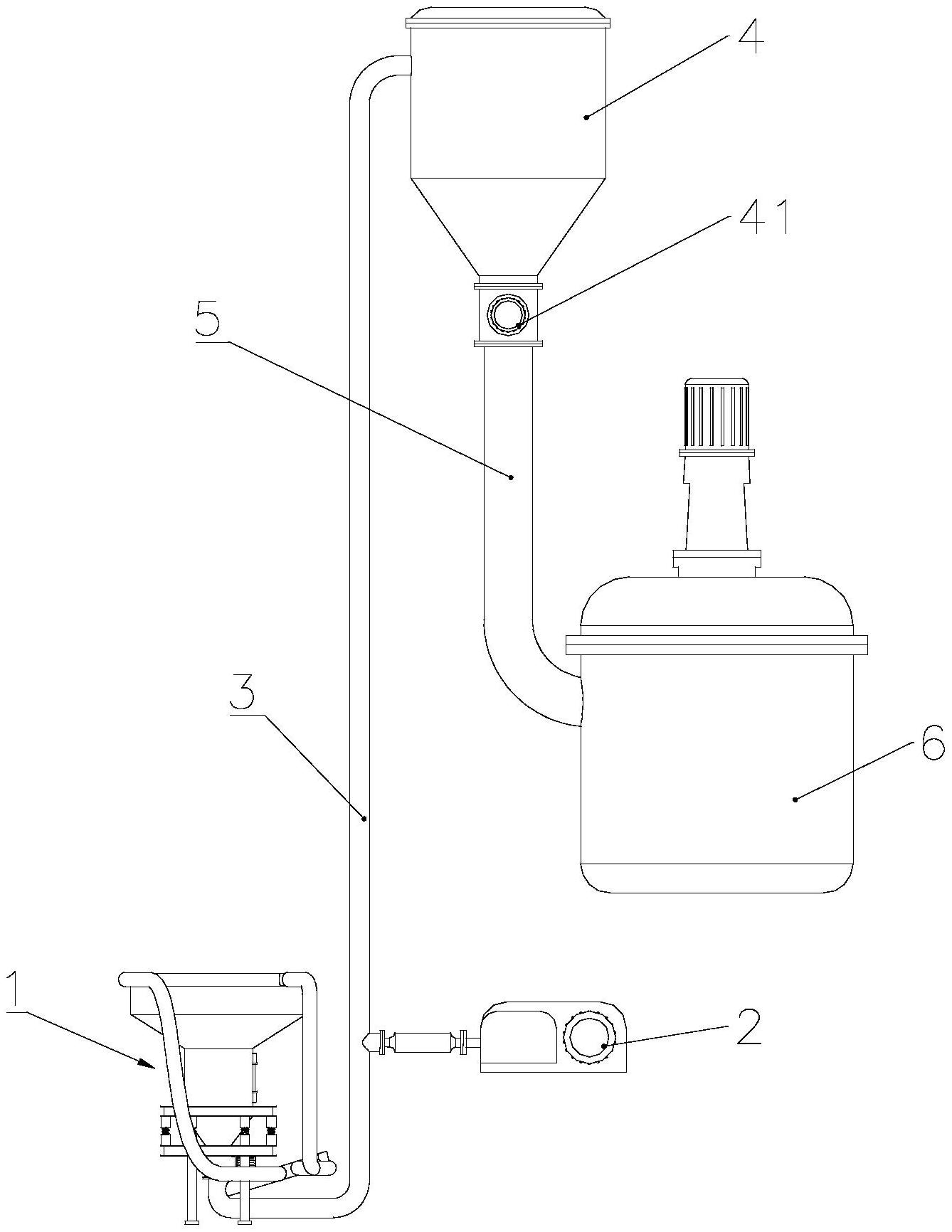 本实用新型属于化工原料投料领域,涉及一种化工原料输送分配系统,包括吨包开袋系统、罗茨风机、第一连接管道、顶仓除尘器、第二连接管道和反应釜,吨包开袋系统包括上料料斗、平衡组件、振动电机和提吊机,上料料斗的底部设有第一电磁阀,上料料斗设置在平衡组件上,振动电机设置在上料料斗的外壁上,提吊机位于平衡组件的旁侧;顶仓除尘器的底部设有第二电磁阀,第一连接管道的两端分别与第一电磁阀以及顶仓除尘器连通,罗茨风机与第一连接管道连接,第二连接管道的两端分别与第二电磁阀以及反应釜连通。本实用新型实现了化工个原料的自动输送分配,通过振动电机和平衡组件的配合能够避免上料料斗产生堵塞,实用性较强。