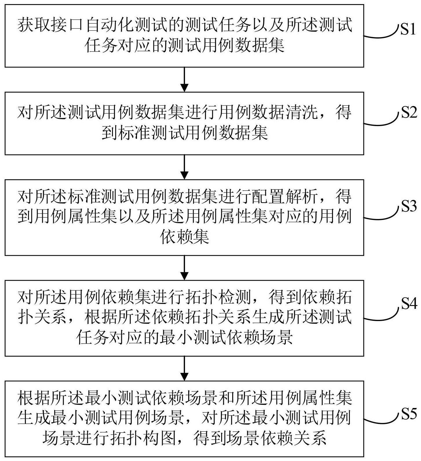 本发明涉及接口测试技术领域,发明了一种接口自动化测试用例的依赖关系分析方法、系统及介质,包括:获取接口自动化测试的测试任务以及所述测试任务对应的测试用例数据集;对所述测试用例数据集进行用例数据清洗,得到标准测试用例数据集;对所述标准测试用例数据集进行配置解析,得到用例属性集以及所述用例属性集对应的用例依赖集;对所述用例依赖集进行拓扑检测,得到依赖拓扑关系,根据所述依赖拓扑关系生成所述测试任务对应的最小测试依赖场景;根据所述最小测试依赖场景和所述用例属性集生成最小测试用例场景,对所述最小测试用例场景进行拓扑构图,得到场景依赖关系。本发明可以提高依赖关系分析的效率。