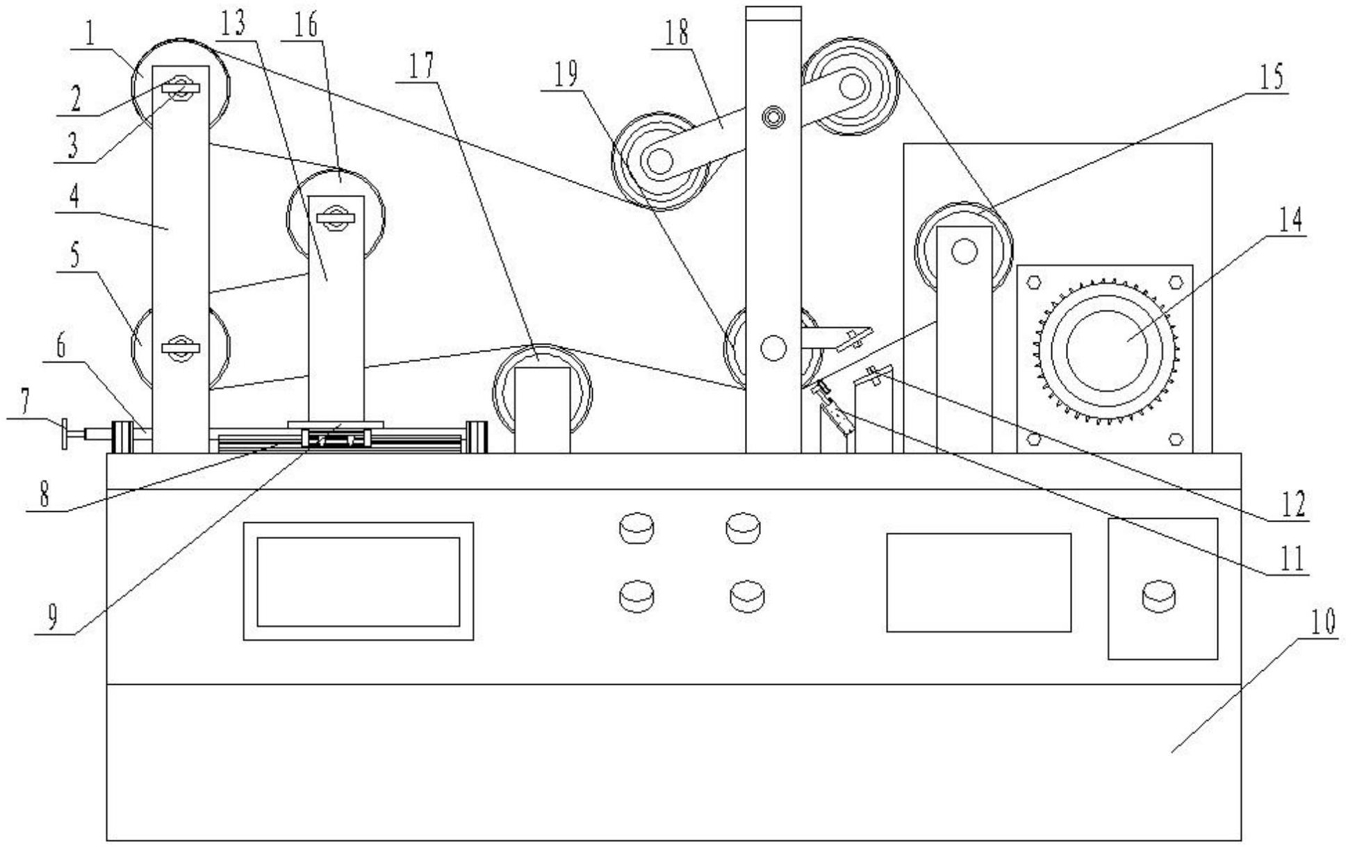本实用新型涉及一种电子标签耐弯曲测试设备,包括主机架,主机架上依次设有主动滚轴、摆臂张力调节滚轴组、后从动扭曲滚轴组、驱动电机、压力检测机构、速度检测器、前从动辊轴,后从动扭曲滚轴组包括上辊组、下辊组、调节辊组,调节辊组两端转动安装有固定架,固定架的底部设有调节装置,前后两侧的转轴之间设有导辊,导辊包括多个且多个导辊直径不等,每个导辊两端面中间设有方形的卡槽,转轴内设有阶梯孔,阶梯孔内设有阶梯杆,阶梯杆上套有弹簧,阶梯杆的外端固定有限位拉杆。本实用新型可以改变弯曲的角度,模拟生产过程中的多种弯曲角度的工况,通过更换不同直径的导辊,可以用来模拟测试不同包角对弯折的影响。
