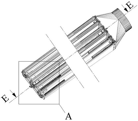 本实用新型公开了一种可变风排的整体调节机构,安装在吹风段风排两侧,该调节机构包括若干个风嘴连接装置以及主调节装置,风嘴连接装置与主调节装置穿过风排两侧的风排封板,固定在风排两侧的支撑板上,每个风嘴内封板均设置有一个风嘴连接装置,且风嘴连接装置和主调节装置均为对称设计,通过一根传动轴将风排左右侧的主调节装置连接,风嘴固定装置与每个风嘴内封板连接,通过主调节装置控制支撑板在宽度方向上水平移动,带动各个风嘴连接装置移动,可使左右侧风嘴内封板整体同时移动,调节风排可出风孔数量。调节方便快捷,减少人工调节时间,且提高了调节的精度,确保左右侧风嘴出风孔均匀分布,适配不同钢化版型,降低能耗。