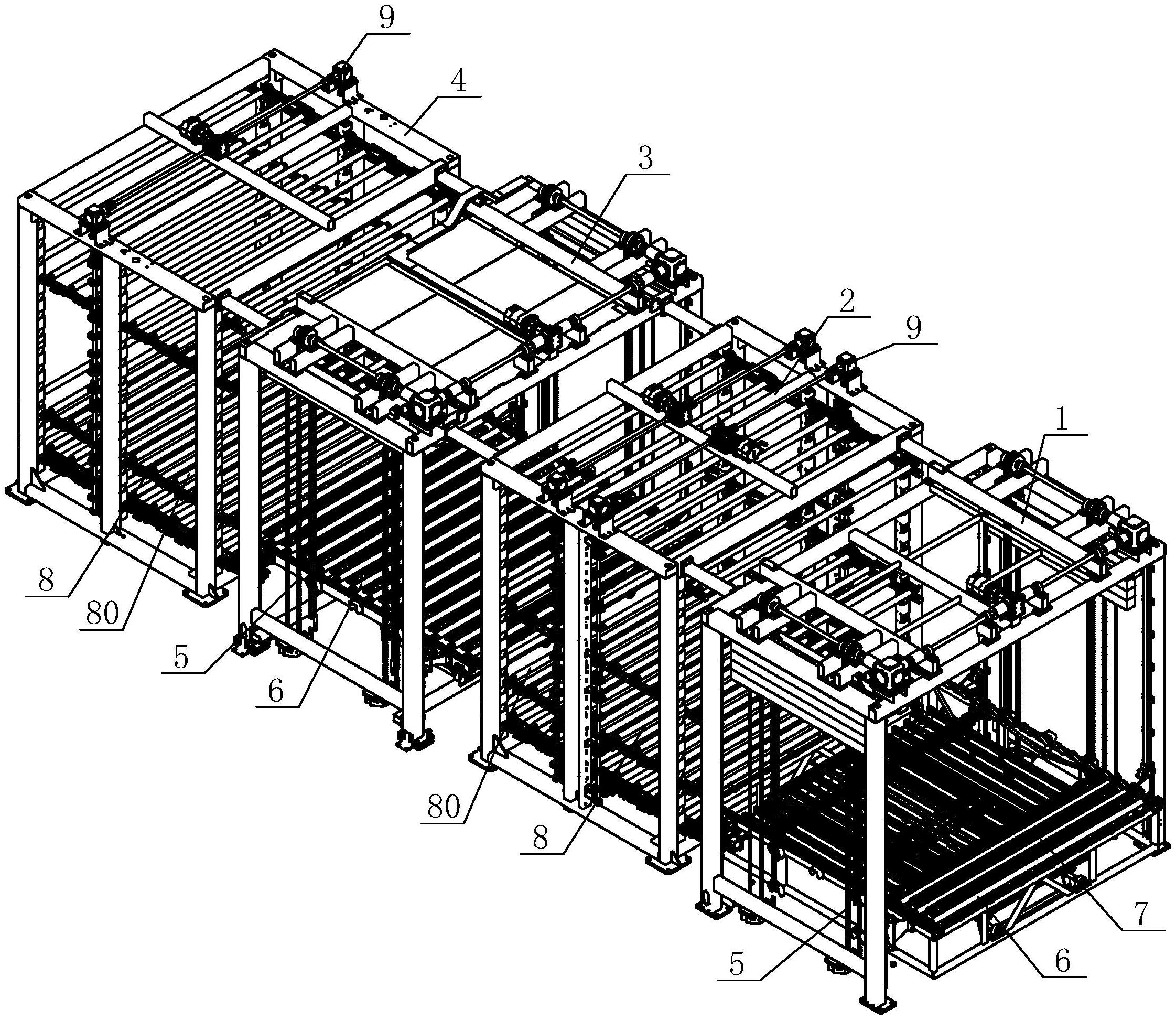 本实用新型公开了一种新型卧式玻璃排版储存装置,解决了设有两个储片库,能够增加储片数,使用两个升降台就可对两个储片库存取玻璃,节约成本和空间。其技术方案要点是:包括依次首尾固定连接的第一升降台、第一储片库、第二升降台和第二储片库,第一升降台包括升降机构、横移机构和用于排版玻璃的排版机构,第二升降台包括升降机构和横移机构,第一储片库和第二储片库均包括多个储存层和分层驱动机构,所述储存层设有多个辊道,多个储存层包括零层,常态下,第一升降台和第二升降台均与零层平齐,通过升降机构带动第一升降台升降可从第一储片库存入或取出玻璃,通过升降机构带动第二升降台升降可从第一储片库或第二储片库存入或取出玻璃。