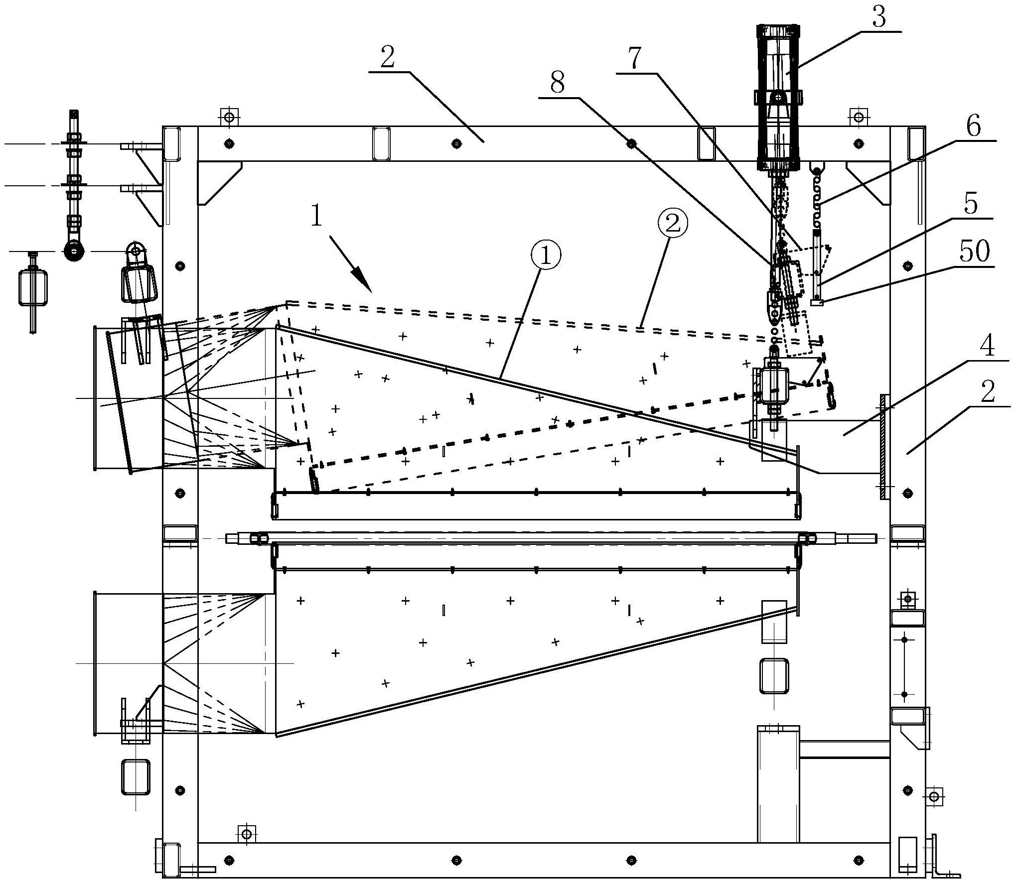 本实用新型公开了一种翻转式上风排限位装置,可以支撑上风排并使其限制在水平工作位置,对向上翻转打开的上风排进行定位和固定,防止上风排突然落下。本实用新型所公开的翻转式上风排限位装置应用于翻转式的风排装置中,其中的上风排安装于机架上,上风排其中一端与机架旋转连接,另一端由升降气缸带动以进行旋转,所述风险防控结构包括水平托块和定位组件,水平托块固定设于机架上,用于支撑上风排并将其限制在水平工作位置;定位组件用于对向上翻转打开的上风排进行限制固定,包括牙杆和限位结构,牙杆悬吊于机架上,限位结构连接上风排,限位结构设有限位槽,牙杆可在上风排翻转打开至特定角度时进入限位槽中时并卡住。