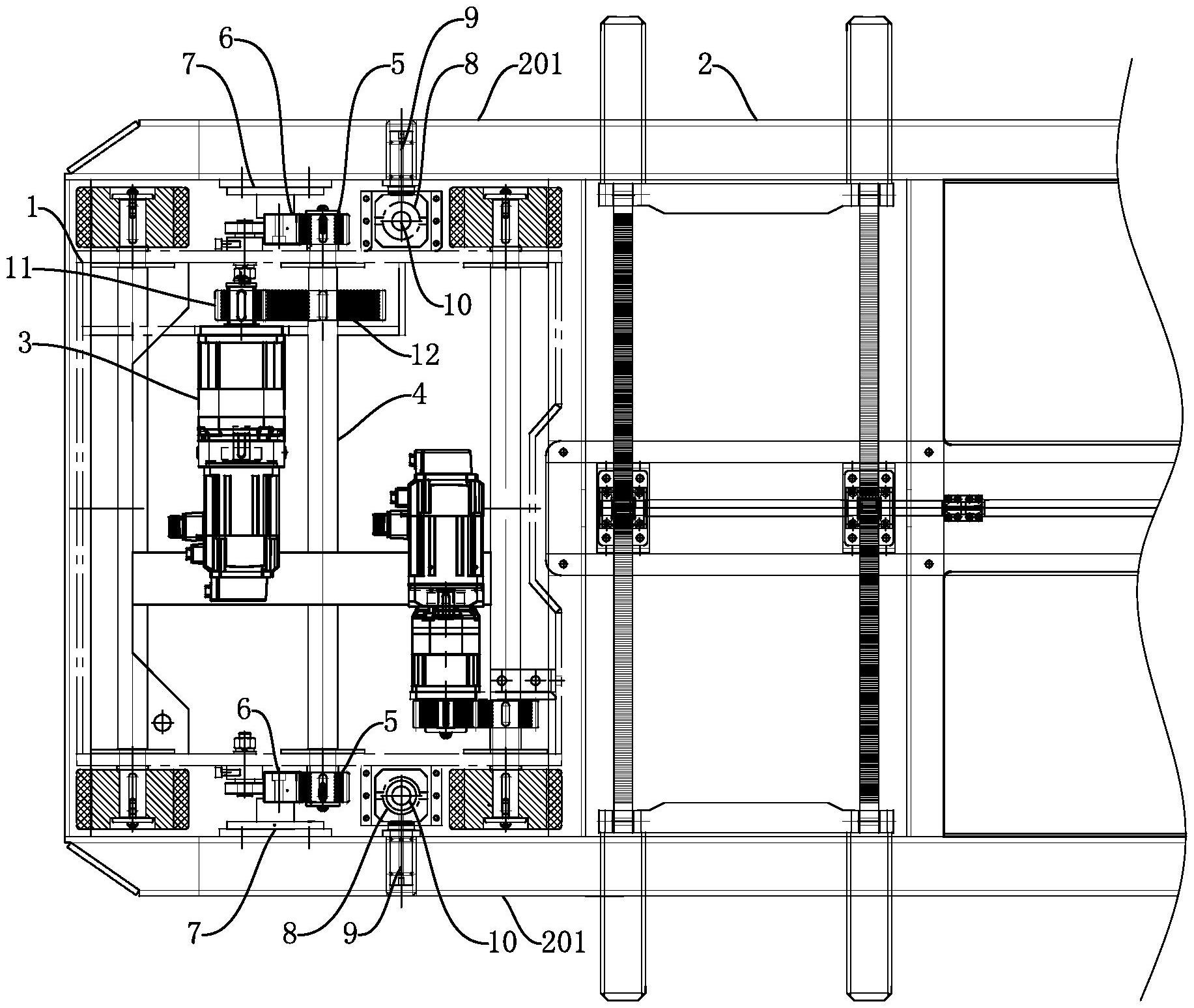 本实用新型公开了一种梳齿搬运器微升降装置,属于立体车库技术领域,包括安装于行走框架上的升降框架,所述行走框架上转动安装有由动力机构驱动的传动轴,所述传动轴的两端固定安装有升降齿轮,所述升降框架上安装有与所述升降齿轮相啮合的升降齿条,所述升降框架的角部安装有导向套,所述行走框架上安装有竖向延伸且与所述导向套相适配的导向柱,所述导向套通过转轴转动安装于所述升降框架的主梁上,所述转轴的轴线水平设置。本实用新型解决了四个行走轮不在同一平面时,导向柱之间产生干涉,导致升降卡阻的技术问题,广泛应用于梳齿车库中。