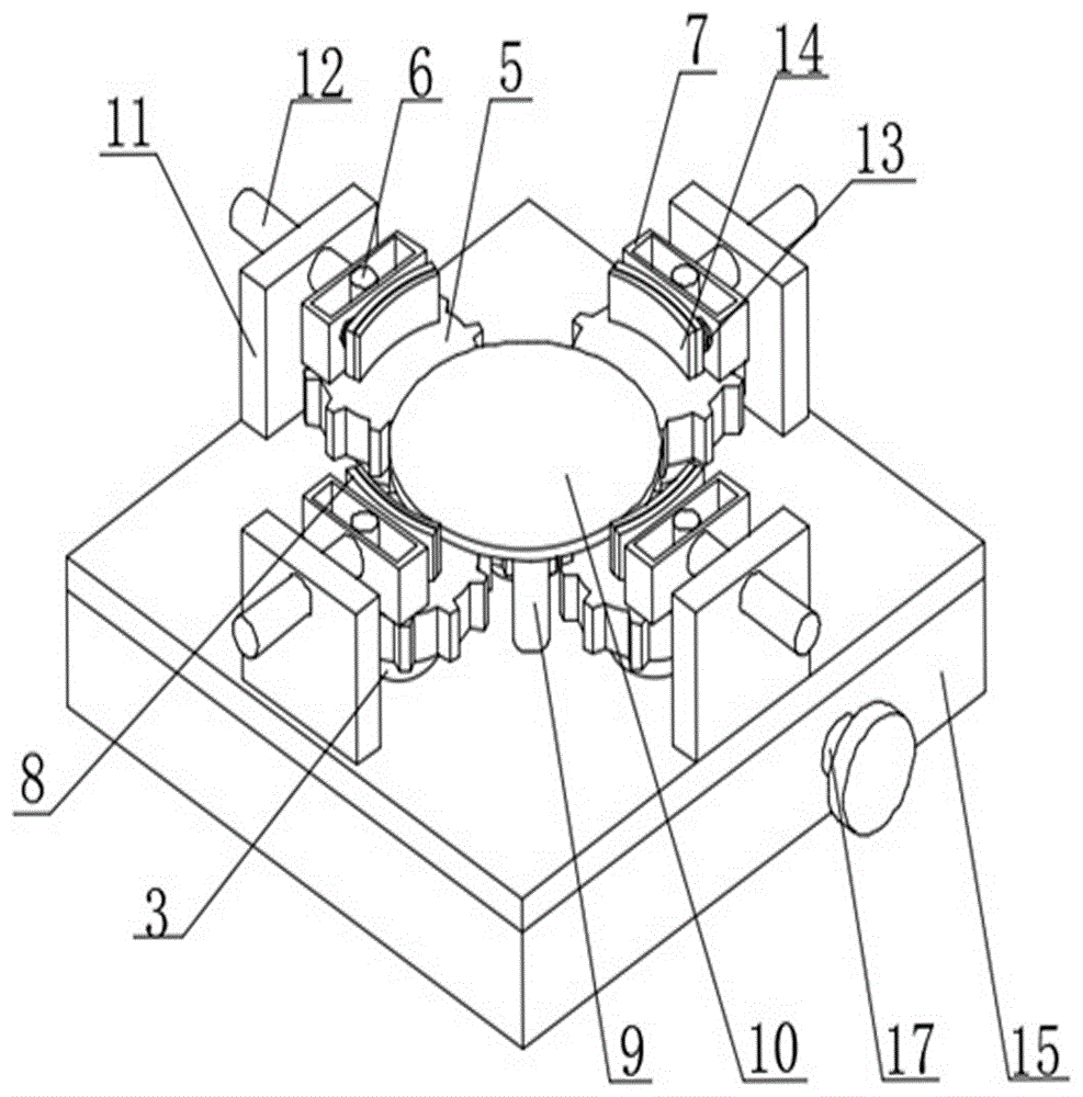 本实用新型提供一种电子表加工用夹具,涉及电子表技术领域,包括加工台,所述加工台的顶部转动连接有第一转杆和第二转杆,第一转杆和第二转杆的顶部分别固定连接有连接齿轮和驱动齿轮,连接齿轮与驱动齿轮相啮合,驱动齿轮的顶部固定连接有固定块,驱动齿轮的顶部放置有矩形框。该电子表加工用夹具,通过电子表机芯放置在放置板的顶部,通过转动第一转杆带动连接齿轮进行旋转,通过连接齿轮与四个驱动齿轮的啮合作用下,驱动四个驱动齿轮一起转动,使四个矩形框一侧面的弧形夹持板向放置板的中心靠近,通过四个弧形夹持板来对放置在放置板顶部的机芯进行夹持固定,该装置具有夹持方便和夹持稳定的优点,提高了对机芯的加工效率。