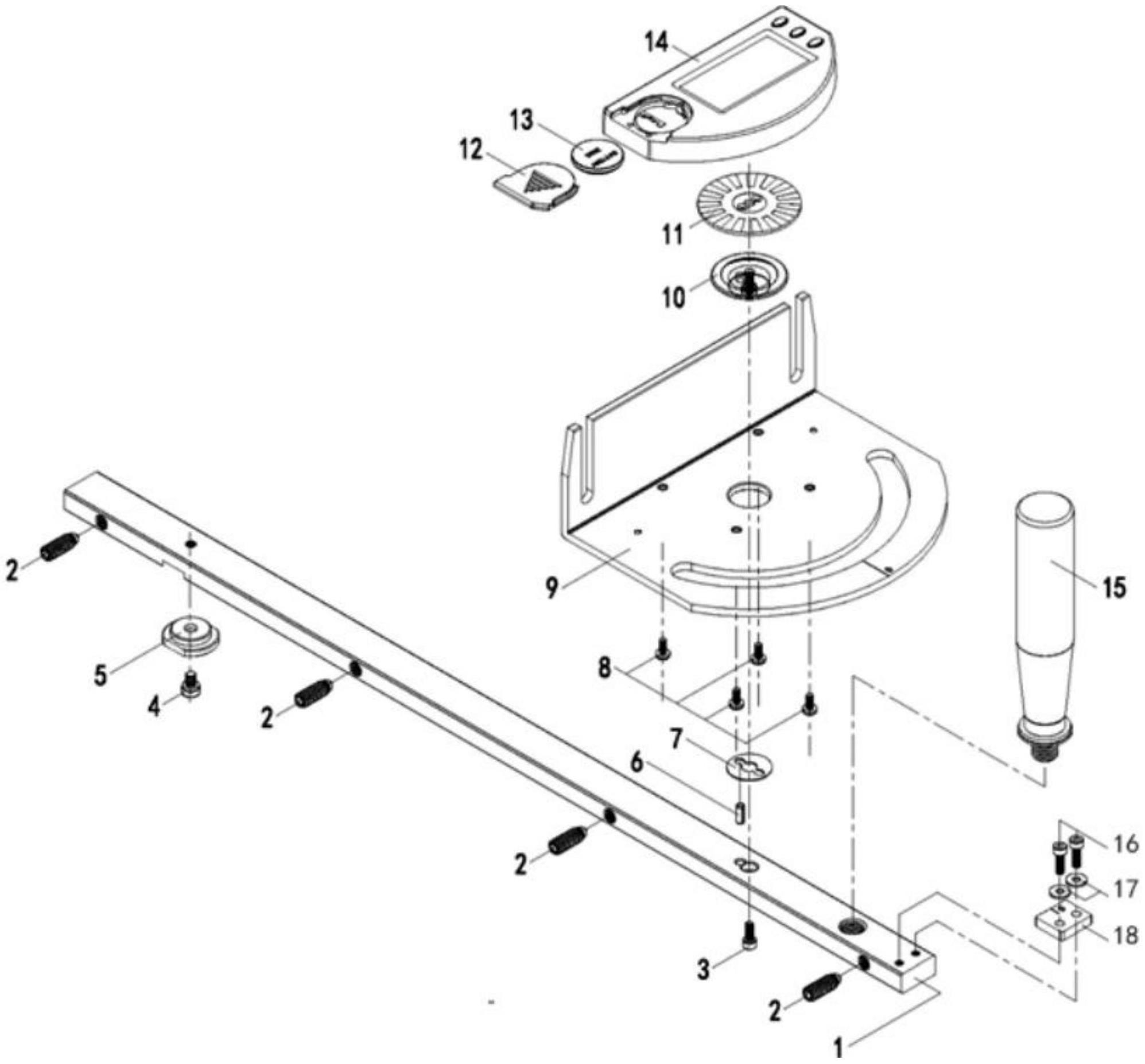 本实用新型公开了一种木工台锯专用的数显工量具,包括数显组件、L型底座和导向杆,数显组件位于L型底座上方,数显组件上设有脉冲发射器和脉冲接收器,数显组件与L型底座之间设有主栅,数显组件和主栅上均设有沿圆周均匀排列的栅格,L型底座下方设有导向杆,L型底座通过转轴固定在导向杆上,L型底座与导向杆形成可相对旋转的架构,主栅安装在转轴上端面,数显组件安装在L型底座上,导向杆侧面设有均匀螺纹连接有波珠螺栓,导向杆后端设有细分刻度盘固定座,导向杆后端上端面设有手柄,手柄穿过L型底座。本实用新型的优点在于:体积小巧、测量精度较高,可以直接当作工装使用,测量精度高,应用灵活。