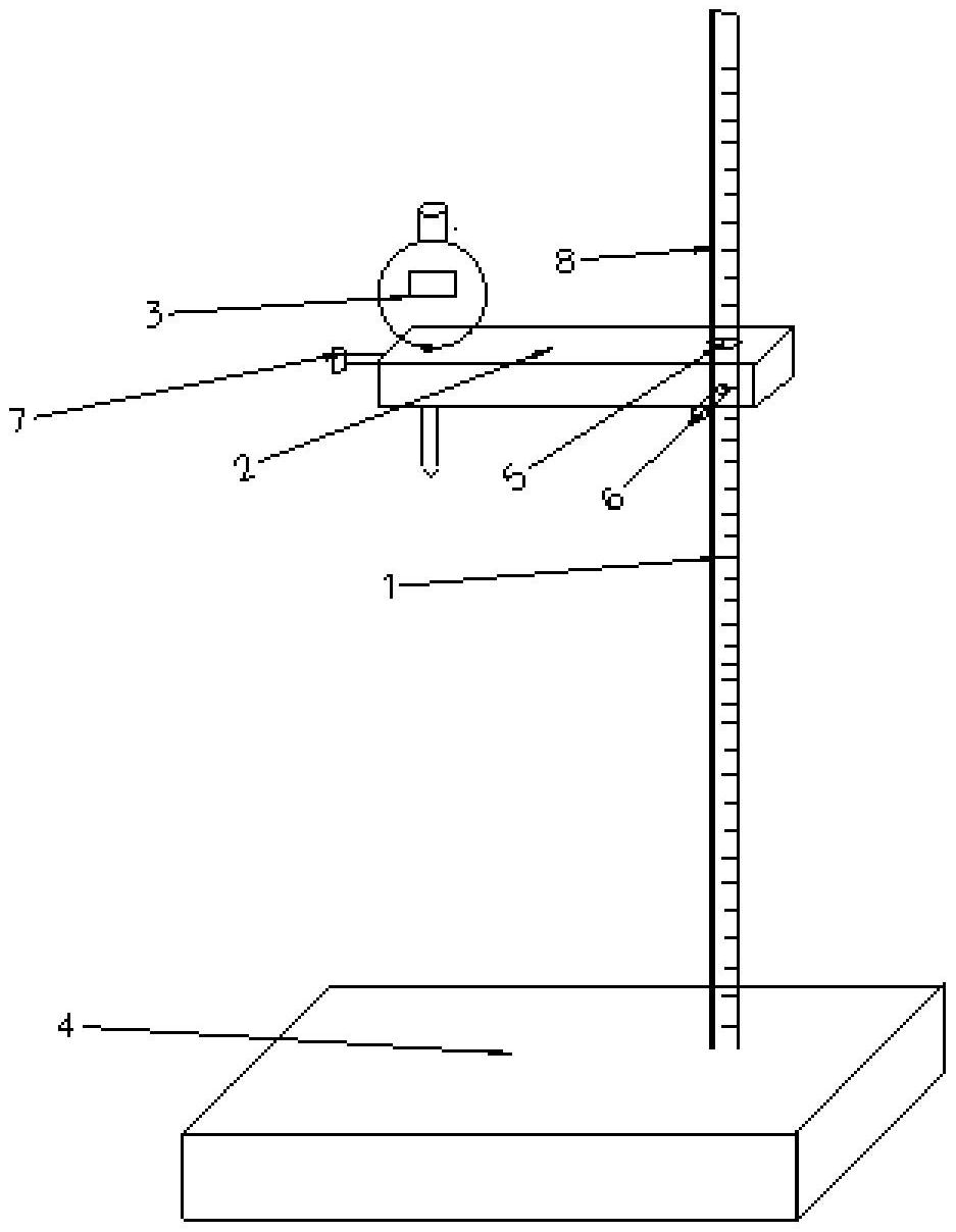 本实用新型提供了一种测量混凝土长期收缩率的装置,包括底座,所述底座顶部固定连接有竖向杆件,所述竖向杆件表面设有竖向标尺,所述竖向杆件游离端滑动连接有横向杆件,所述横向杆件远离所述竖向杆件的一端连接有千分表,所述千分表设有太阳能光伏板,通过太阳能电源供电。使用本实用新型的测量仪,每次测试混凝土收缩率,既不用移动混凝土试块位置,也不用采用标准杆校准千分表位置,直接在竖向标尺确定千分表的初始位置,测定记录混凝土的长期收缩率,确保了测试结果的准确性和精确性,有效降低了影响试验结果的误差因素;同时千分表为太阳能电源供电,方便长期使用、节能环保。