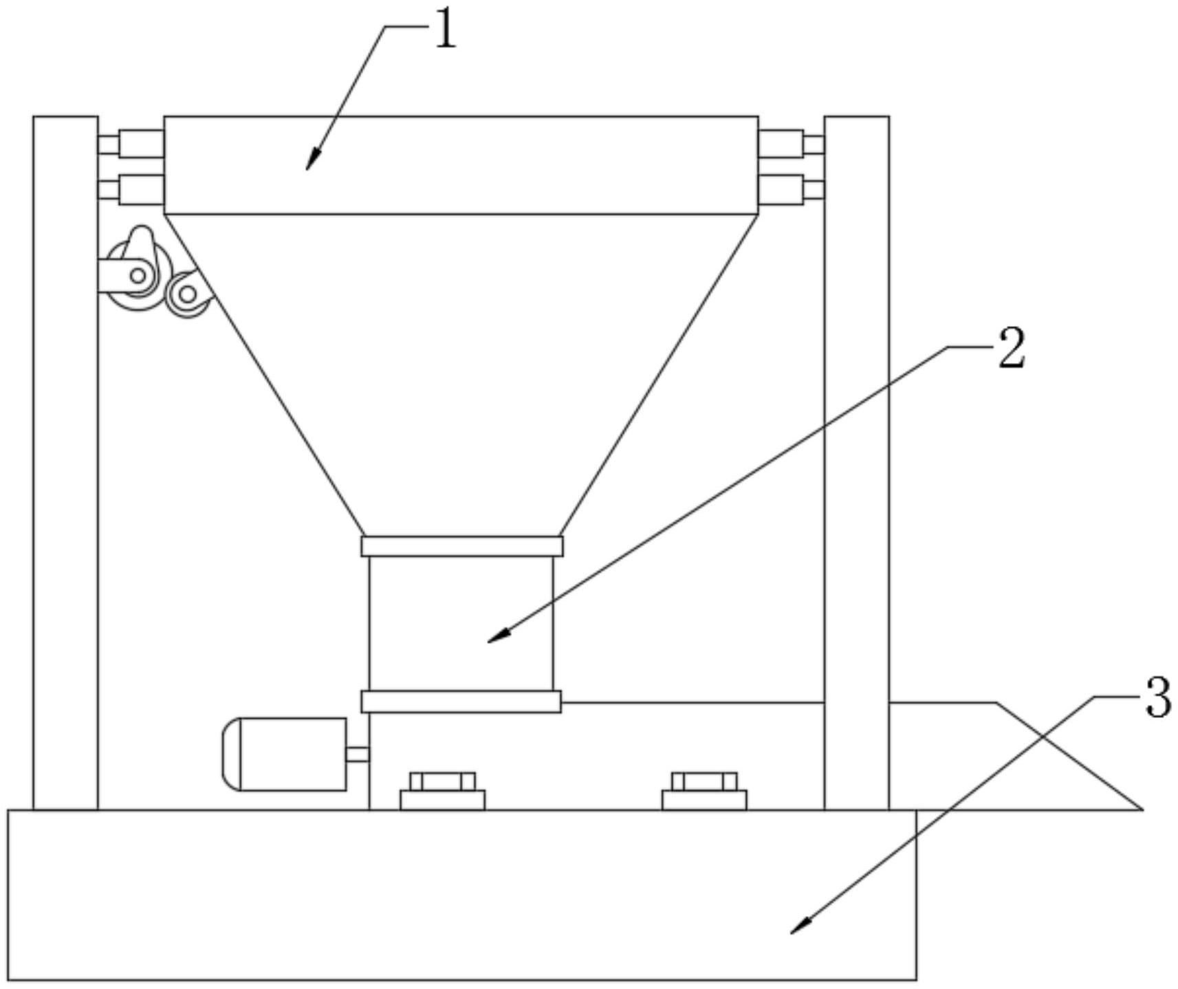 本实用新型提供一种混凝土自动喂料装置,包括支撑杆一、弹簧杆、下料斗、支撑杆二、出料槽、橡皮管、电机一、偏心轮、绞龙轴、电机二以及从动轮,混凝土喂料主体上侧安装有下料斗,下料斗左右两侧安装有弹簧杆,弹簧杆左侧安装有支撑杆一,弹簧杆右侧安装有支撑杆二,支撑杆一右侧安装有偏心轮,偏心轮后侧安装有电机二,下料斗左侧安装有从动轮,下料斗下侧安装有橡皮管,橡皮管下侧安装有出料槽,出料槽内部安装有绞龙轴,出料槽左侧安装有电机一,该设计解决了原有混凝土在喂料时易卡料的问题,本实用新型结构合理,便于有效防止混凝土在喂料时卡料情况的发生。
