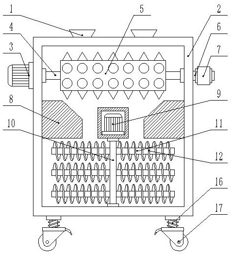 本实用新型涉及混凝土管桩制造技术领域,具体是一种混凝土管桩生产用上料装置,所述混凝土管桩生产用上料装置包括:搅拌箱,用以加工混凝土原料;粉碎机构,所述粉碎机构位于搅拌箱的内部且与搅拌箱转动连接;以及搅拌机构,所述搅拌机构位于搅拌箱的内部且与搅拌箱转动连接,能够同时完成混凝土的粉碎和搅拌,通过该装置,能够将混凝土原料的粉碎和搅拌流程相结合,在提高混凝土粉碎效果的同时提高了搅拌效果,提高了混凝土的加工效率,降低了装置的使用成本。