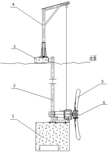 本实用新型属于机械设备技术领域,涉及一种新型推流机水下安装结构,其特征在于它包括水上部分与水下部分;所述水上部分包括水面固定支架及安装在水面固定支架上的调节式吊头;所述水下部分包括固定支柱,固定支柱的下端固定于混凝土底座上,混凝土底座上设有推流机支撑座;所述固定支柱与水面固定支架连接,欲安装推流机可沿固定支柱上下移动。本实用新型安装方便、快捷;不用抽干池中水,适用于任何环境下。