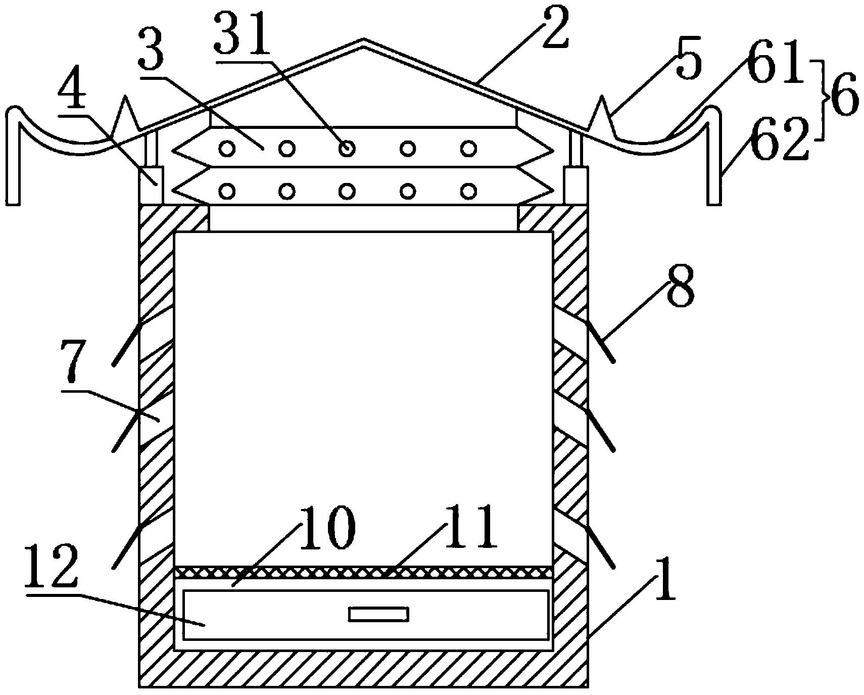 本实用新型公开了一种新型分子筛型的微纳米曝气机,曝气机本体上通过电动推杆设有倒V形顶板,倒V形顶板的上表面的前后侧设有V形挡雨板,倒V形顶板的左右侧设有纵向挡雨板,纵向挡雨板上设有通孔,倒V形顶板上位于纵向挡雨板和V形挡雨板的交接处设有集雨槽,集雨槽的端部部穿过通孔与排水管道贯穿连接,排水管道包括弧形管道和竖直管道。曝气机本体上设置有倒V形顶板,倒V形顶板可在防雨的同时结合集雨槽和排水管道进行排水,排水管道经过特殊设计,可利用虹吸的原理进行快速排水;倒V形顶板通过电动推杆与曝气机本体的顶部固定连接,可使得倒V形顶板上下移动,从而将位于曝气机本体内的热量排出。