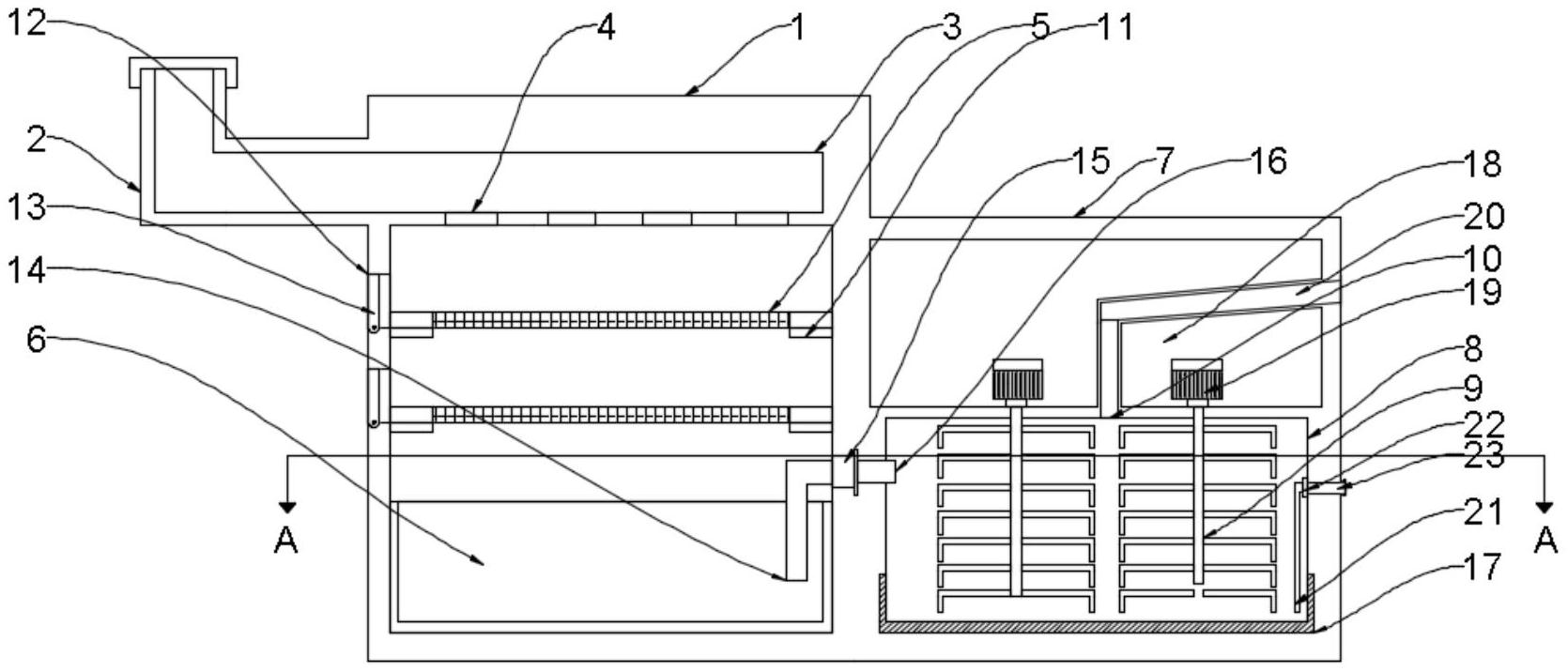 本实用新型公开了一种工业废水回收利用装置,涉及废水回收技术领域,为解决现有提出工业废水中含有的杂质较多,一般在进行初步过滤时不够到位并且不易取出杂物,长时使用影响废水过滤质量,同时在进行药物净化时也出现融合不到位的问题。所述第一处理箱一侧设置有废水管,所述第一处理箱内开设有入水槽,所述入水槽内底部开设有等距分布的开口,所述第一处理箱内设置有对称的过滤网,两个所述过滤网上下陈列,所述第一处理箱内底部设置有沉淀箱,所述沉淀箱位于过滤网下方,所述第一处理箱一侧设置有第二处理箱,所述第二处理箱内设置有搅拌槽,所述搅拌槽内设置有对称的搅拌杆,所述搅拌槽顶部开设有入药口。