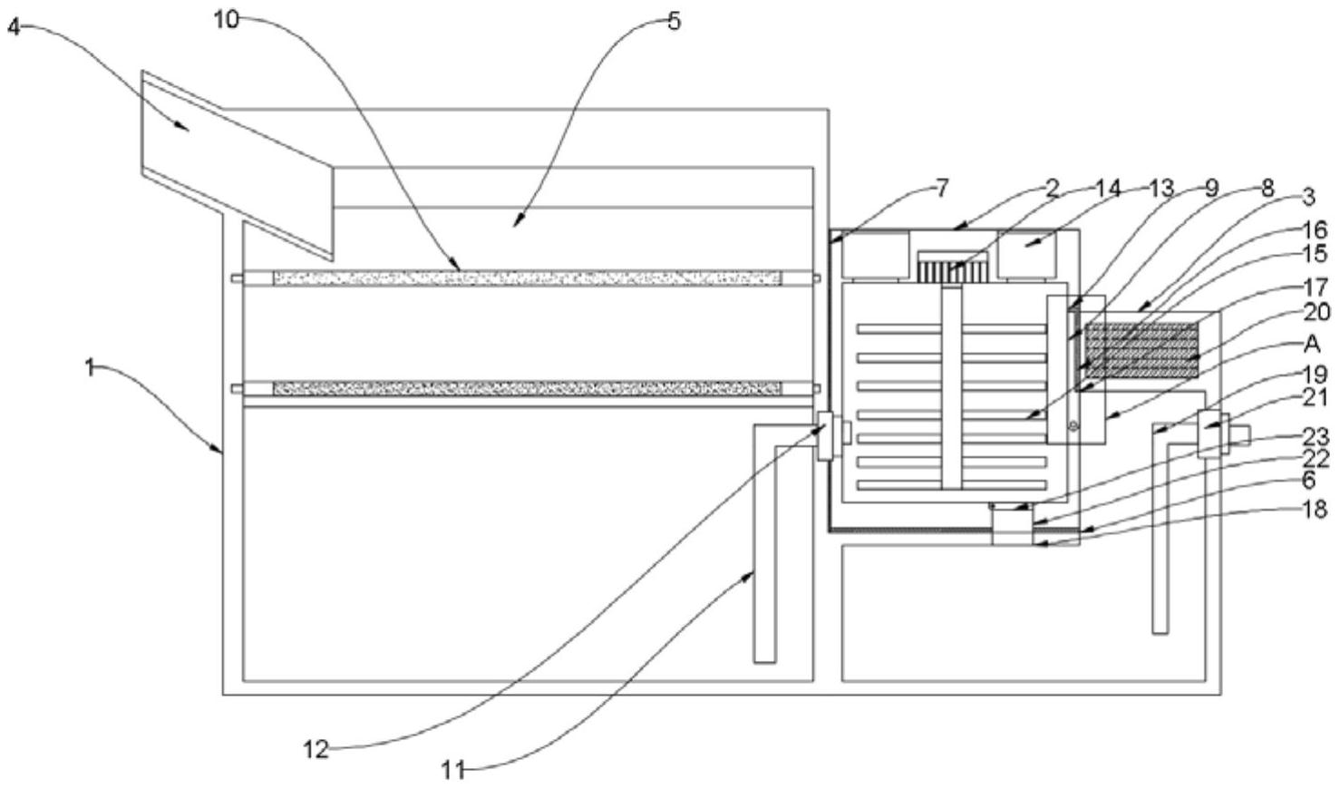本实用新型公开了一种便于置换零件的污水处理装置,涉及污水处理技术领域,为解决现有提出设备在使用过程中若出现设备故障,不便于对其进行置换或是对其进行维修维护的问题。所述第一处理箱一侧设置有第二处理箱,所述第二处理箱一侧设置有第三处理箱,所述第一处理箱另一侧设置有入水口,所述第一处理箱后端设置有第一检修板,所述第二处理箱下端设置有第一吸铁层,所述第二处理箱另一侧设置有第二吸铁层,所述第二处理箱通过第一吸铁层与第三处理箱吸附连接,所述第二处理箱通过第二吸铁层与第一处理箱吸附连接,所述第二处理箱一侧设置有第二检修板,所述第二检修板上端设置有第三吸铁层,所述第三吸铁层与第二处理箱活动连接。