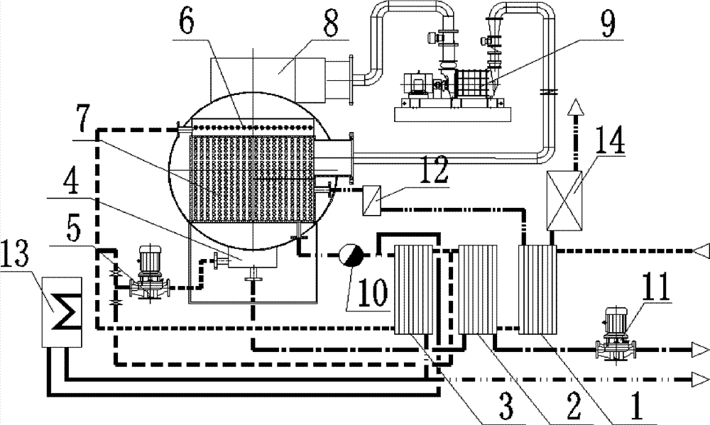 本发明公开了一种一体化HPDM热泵垃圾渗滤液处理装置,利用在热量循环过程中将垃圾渗滤液中盐和有机污染物与水分离,使垃圾渗滤液得以净化;它能够通过压缩二次蒸汽,使其压力和温度上升,再次作为热源回用到系统,实现蒸汽热量的循环利用。本发明的处理装置,主要有包括换热器一(1)、换热器二(2)、换热器三(3)、循环液收集器(4)、循环泵(5)、水平管液膜布水器(6)、水平管液膜换热器(7)、气液分离过热器(8)、蒸汽压缩机(9)、疏水器(10)、浓液泵(11)、气体分离器(12)、蒸汽发生器(13)和膜式氨氮分离浓缩器(14),所述的换热器一(1)、换热器二(2)和换热器三(3)串联连接,换热器一(1)上设有渗滤液进口,换热器三(3)设有渗滤液出口通过管道与循环泵出口连接。