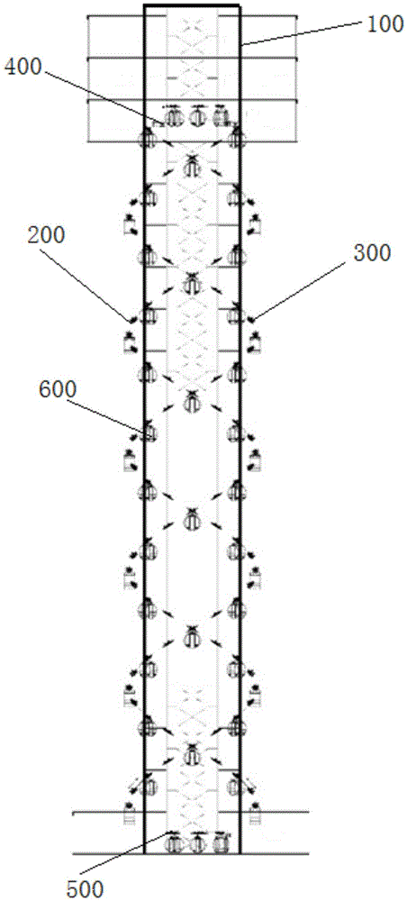 本实用新型公开了一种螺旋形观光结构,所述螺旋形观光结构直接沿竖直方向设置在建筑的外立面上或者建筑内部。本实用新型结构简单,成本低,可与任何建筑(塔、楼等适合安装本观光结构的各式构筑物)配合使用,使用范围非常广。