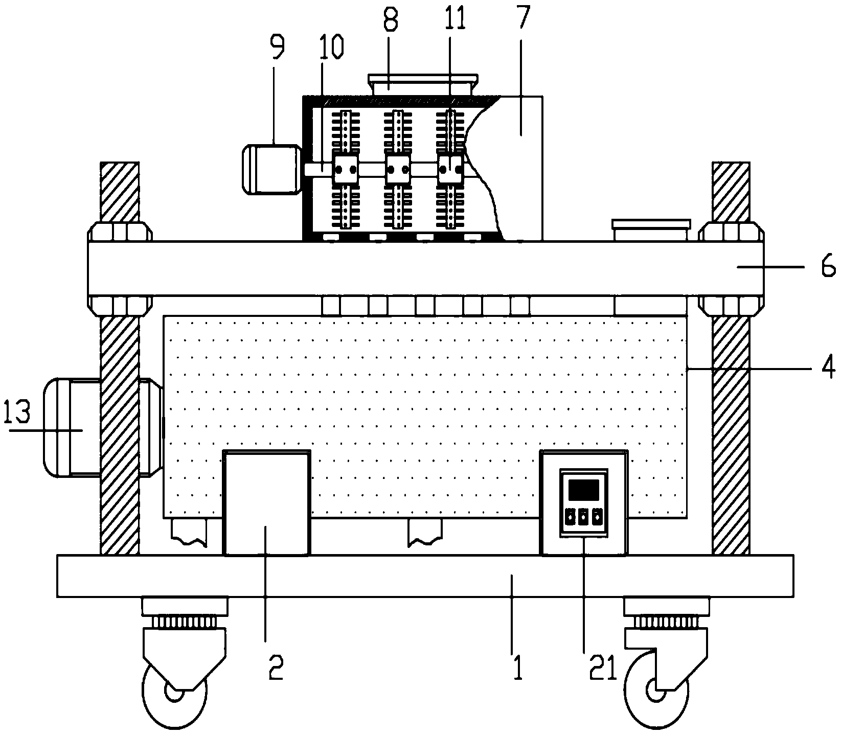 本实用新型公开了一种环保型螺旋压榨污泥机,包括底板丶箱体和振动电机,底板上端固定设置有两组底座,两组底座上端均设置有放置槽,箱体配合放置于放置槽上端,底座上端纵向设置有两组螺纹杆,螺纹杆上端设有顶板,顶板上端设有搅拌箱,搅拌箱上端设置有添加口,搅拌箱一侧设置有第一电机,搅拌箱内腔转动设置有搅拌轴,且搅拌轴一端与第一电机动力输出端固定连接,本实用新型通过添加剂搅拌箱将化学反应添加剂搅拌混合后导入压榨箱体内对污水进行净化处理,同时在出水的筛网底部设置有振动电机防止螺旋压榨污泥时污泥中的垃圾杂质填充筛网,另外本实用新型设置有移动机构便于整体在后期维护移动。
