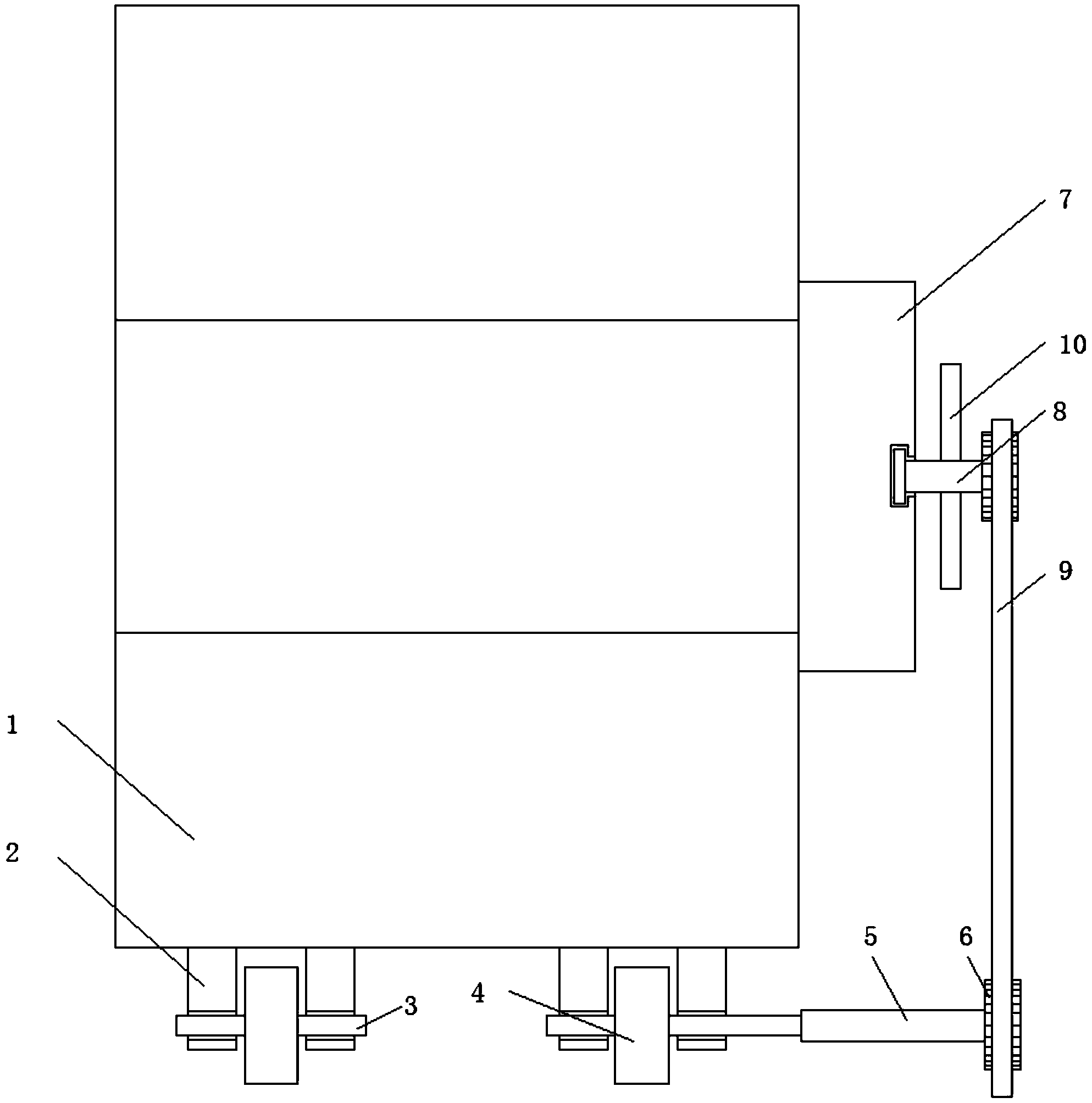 本实用新型涉及冷热冲击箱技术领域,且公开了一种三厢式冷热冲击试验箱,包括箱体,箱体底部的两侧均固定安装有竖板,竖板的内部活动套装有转轴,转轴的两端均延伸至竖板的外部,转轴的外部固定安装有滚轮,转轴的数量为两个,右侧转轴的一侧固定安装有第一圆杆,第一圆杆的外部固定安装有齿轮,箱体的右侧固定安装有储存箱,储存箱的内部活动套装有第二圆杆,第二圆杆的一端延伸至储存箱的内部,齿轮的数量为两个;该三厢式冷热冲击试验箱,移动装置时,滚轮转动最终使得第二圆杆转动,通过第二圆杆的转动带动扇叶转动,从而产生环境空气,环境空气通过通孔进入存储箱的内部,试验时储箱内部的空气抽进箱体内部,从而降低试验成本。