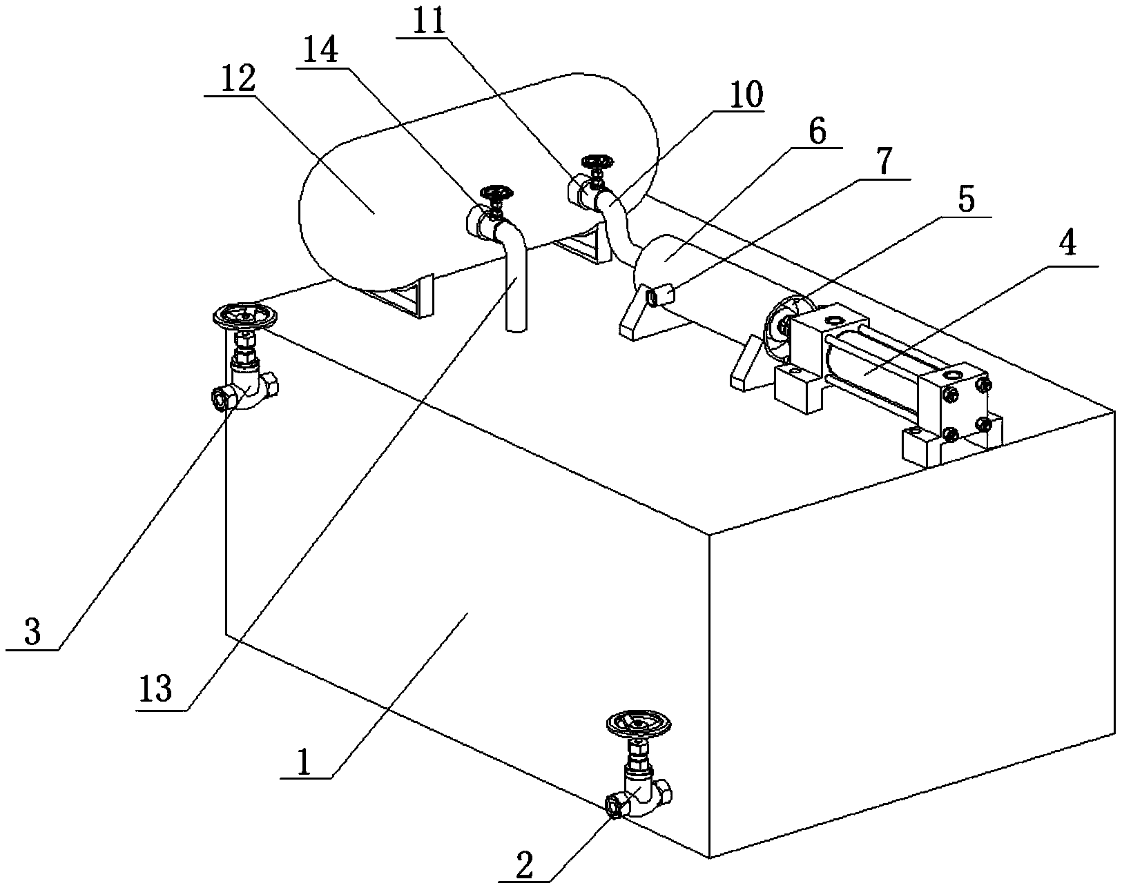 本实用新型涉及消防设备技术领域,且公开了一种高压防水箱的高压装置,包括水箱,所述水箱正面的底部固定安装有排水管,所述水箱正面的顶部固定安装有进水管,所述水箱顶部的一侧固定安装有液压缸,所述液压缸的活塞杆上固定套接有加压活塞,所述加压活塞的外部活动套接有加压套筒。该高压防水箱的高压装置,通过液压缸和加压活塞、加压套筒、气罐的相互配合,启动液压缸的时候能够持续向气罐的内部充气,从而使得气罐内部的压强远高于外界的大气压,储存在气罐的内部,使用的时候,通过出气管阀门和出气管的相互配合,能够将气罐内部的气体向水箱中排放,便于对水箱的内部形成高压强,从而形成高压水流进行灭火处理。