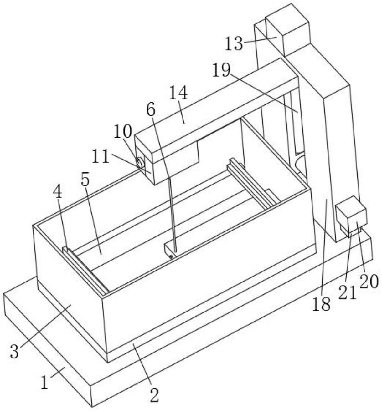 本实用新型公开了一种电火花工具头切割装置,包括底座和位于底座上方的电极线,所述底座的顶部设置有固定切割机构,底座的顶部滑动连接有底板,底板的顶部可拆卸连接有挡板,底板的顶部两边均固定连接有平行于底座顶部的支撑块,支撑块的顶部滑动连接有夹块。本实用新型通过设置的转轴三,将待加工材料固定在夹块上,对电极线通电,移动底板,使得电极线切割原材料,在电极线使用一段时间后,启动电机二和电机三,电机二松开电极线,电机三带动转轴二转动,转轴二带动绳索移动收卷,绳索带动绑定块移动,绑定块带动电极线移动,电极线不断绕着转轴转动,有利于保持电极线垂直固定的同时方便电极线的收卷。