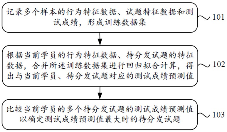 本申请公开了一种试题分发方法,包括以下步骤:训练数据集包含多个样本的行为特征数据、试题特征数据和测试成绩;所述行为特征数据,包含对资源的访问行为的统计数据;所述试题特征数据,是用于表示试题标识或评价值的数据;根据当前学员的行为特征数据、待分发试题的特征数据,合并所述训练数据集进行回归拟合计算,得出与当前学员、待分发试题对应的测试成绩预测值;比较当前学员的多个待分发试题的测试成绩预测值,确定测试成绩预测值最大时的待分发试题。本申请还包含用于实现所述方法的装置。本申请解决现有技术的学习软件在反复学习时输出学习资源效率低、不能适应学员具体情况的问题。