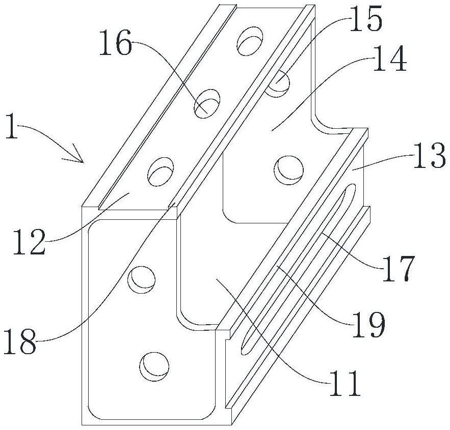 本实用新型公开了异形楼面龙骨专用连接阴角,包括连接阴角本体,连接阴角本体包括L型固定基板、设置在L型固定基板顶端的顶板、设置在L型固定基板侧部的连接侧板、设置在L型固定基板前后两端部的端部加固板、开设于两个端部加固板上的端部固定孔、开设于顶板上的顶部固定孔、开设于连接侧板上的侧面销钉孔、一体成型于顶板上且位于顶部固定孔两侧的顶部加固凸起和一体成型于连接侧板上且位于侧面销钉孔两侧的侧面加固凸起。本实用新型通过在连接阴角本体与楼面龙骨连接侧设置腰型的侧面销钉孔,楼面龙骨端头只需居中开销钉孔即可连接,大大减少龙骨种类,减少生产压力,而且使用操作简单、生产方便,可回收再用,且有利于异形楼面拼装后整形。