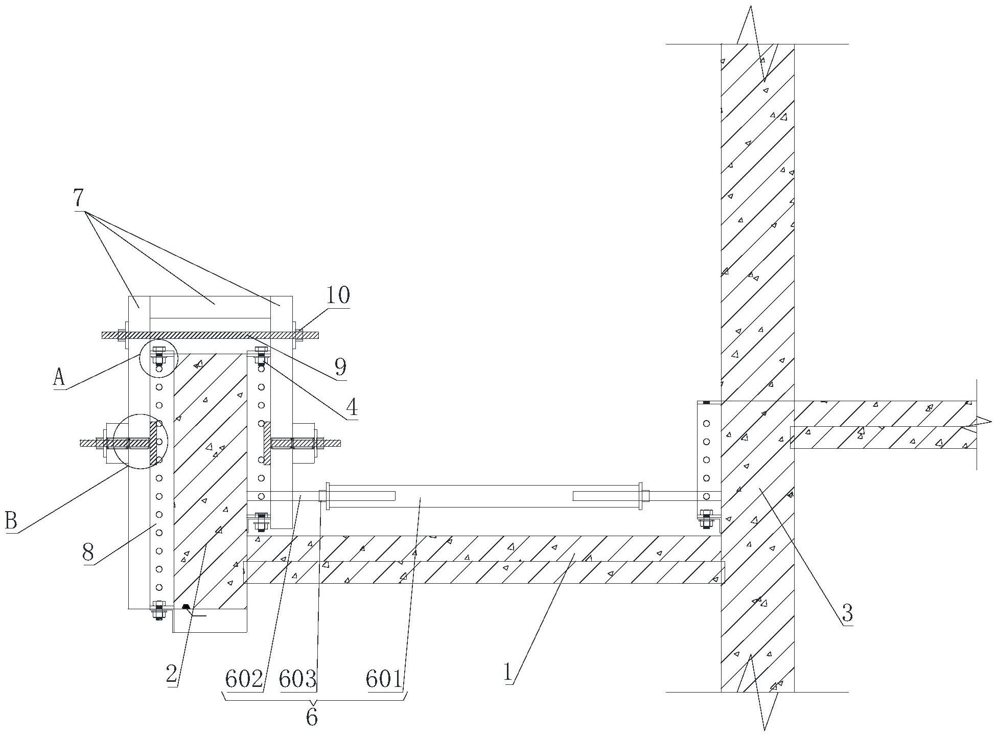 本实用新型涉及建筑模板加固技术领域,且公开了一种沉降种植阳台的加固装置,包括延展安装板和背楞架,延展安装板固定安装于阳台前墙体左右两侧,背楞架由顶部背楞和与顶部背楞焊接的左右两个背楞构成,左右两个背楞的上端通过一字螺杆和锁紧螺母连接,左右两个背楞相对的一侧均设置有连接板,连接板与延展安装板通过连接机构固定连接,延展安装板的中部通过紧固机构与左右两个背楞连接。该沉降种植阳台的加固装置,不需要在阳台墙体及阳台底面上打对穿孔,既能满足防水要求同时也能很好的保证成型质量,防止下口爆模,操作简单、快捷,单人就可操作。