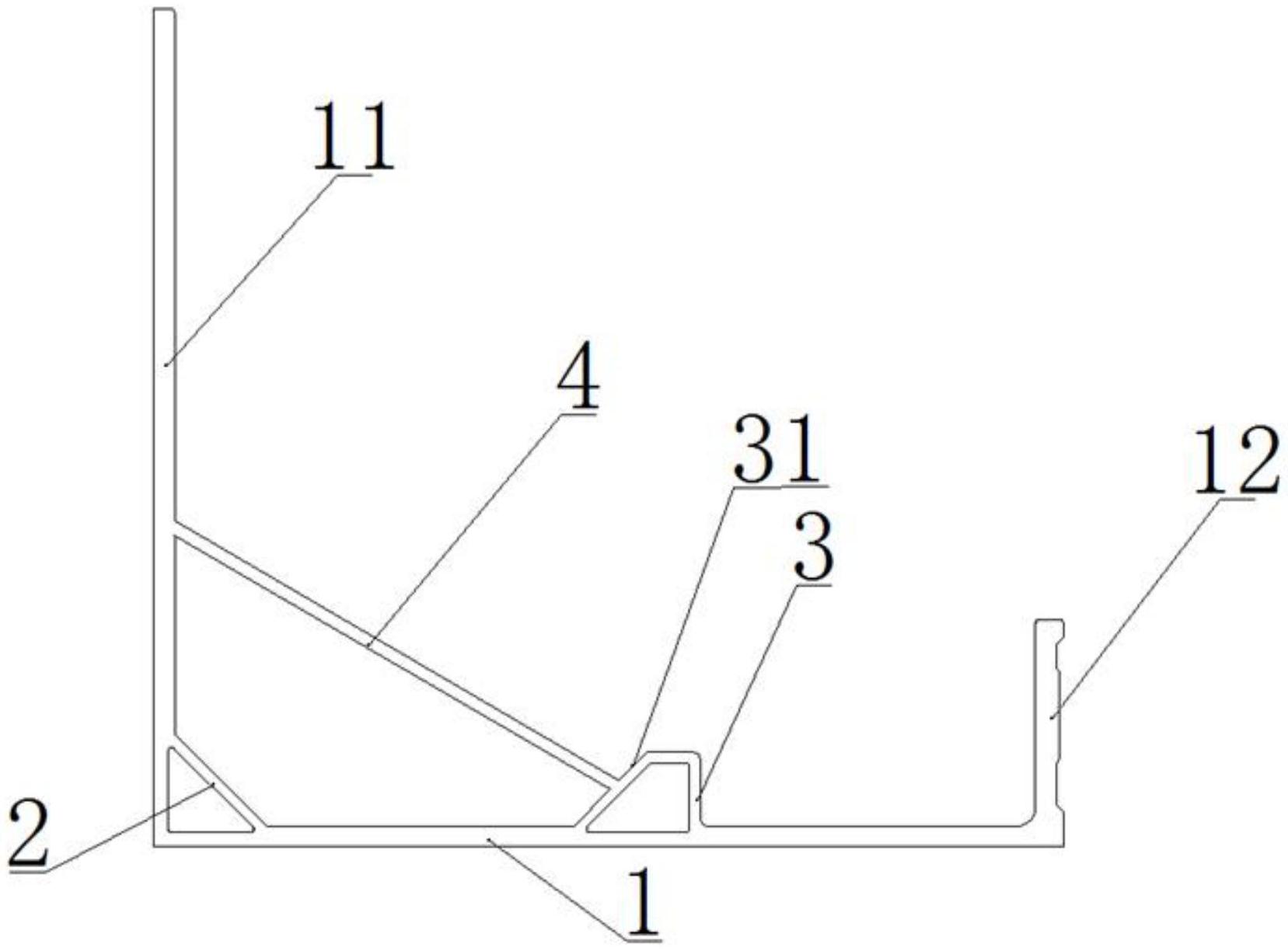 本实用新型涉及一种新型一体式楼梯踏步铝合金模板型材,其属于楼梯踏步铝合金模板领域。包括底板,底板的两端设有与底板一体成型的封板甲和封板乙,封板甲的长度长于封板乙的长度。本申请的新型一体式楼梯踏步铝合金模板型材可以做到铝模板整体使用,将底板与封边板甲和封边板一体成型,取消拼装缝隙,从而解决涨模及无法达到施工尺寸要求的问题,浇筑之后的混凝土平面度平整;并且设计方案简单,铝模板型材一体成型,在底板上还设有多边形的光面加筋,起到加固作用,整体性更好,在拆卸时不需要花费太多的时间,对于建筑工人来说大大提高了工作效率,也减轻频繁的工作量,总之在达到整体效果的同时节省了时间和减少了劳动量,又提高了效率。