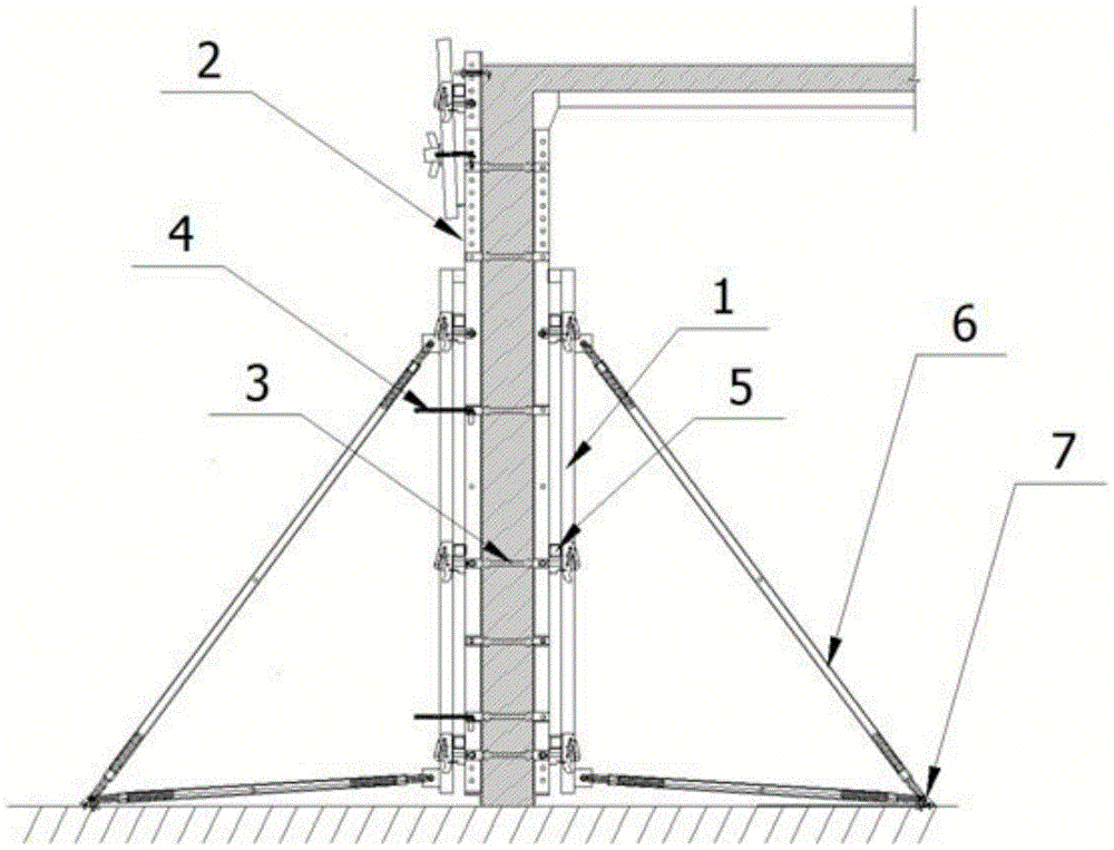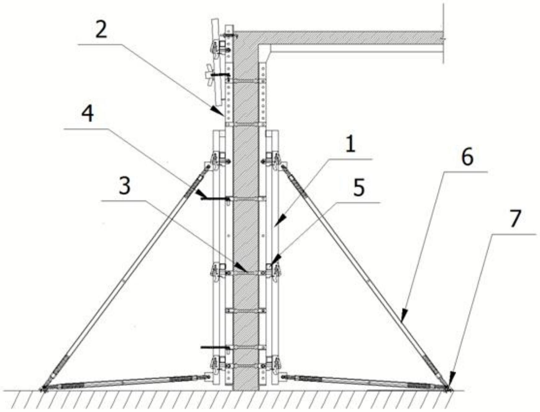 本实用新型涉及一种拉片体系的竖向加固装置,其属于拉片装置领域。包括铝合金模板,铝合金模板上设有至少一组可拆卸的竖向背楞加固件,竖向背楞加固件上设有固定连接的耳板,耳板上设有可拆卸的斜拉支撑杆。本申请中的新型拉片装置通过采用竖向背楞加固件,将竖向背楞加固件用L型螺栓与模板孔位连接,这样可以改变现有技术中单点加固导致稳固性差的现状,然后再由斜拉支撑杆与竖向背楞加固件上的耳板连接从而起到整体加固的作用,从而可以确保铝合金模板的稳固性,这样浇筑砼之后的垂直平整度也就非常高。