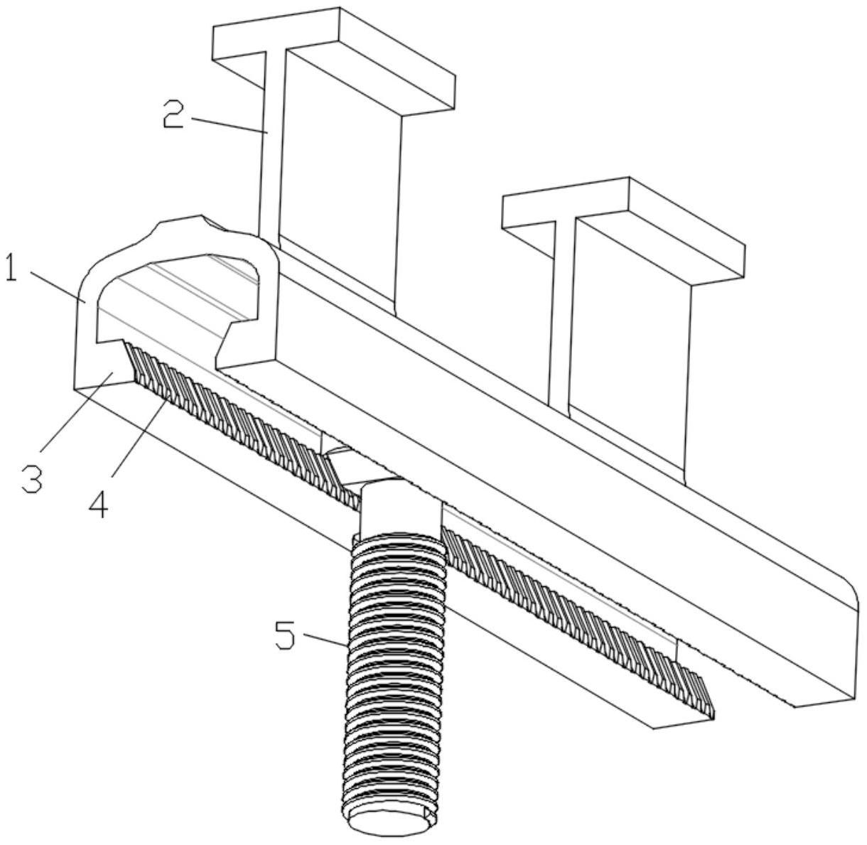 一种高强铝合金防滑预埋槽道,涉及建筑机电安装技术领域,包括开口呈C形的槽体,其特征在于,所述槽体开口处的左右两侧均设有挡板,两块挡板以槽体中线为对称轴对称设置,两块挡板相对的一面设置呈下降楔形,所述挡板上设置呈下降楔形的一面均匀布设有咬合齿,所述槽体内还设有可在槽体内滑动的防滑组件,通过预埋槽C形槽体的设置,同时在槽体的两侧设置布设有咬合齿的下降楔形挡板,同时在下降楔形面上设置咬合齿,可有效的提高槽体和防滑组件之间的相对稳定性,通过槽体上顶面加强组件的设置,可有效提高槽体和混凝土连接的稳定性,本实用新型可有效提高槽道承载能力,同时增加槽道的使用寿命,达到节能减排的目的。