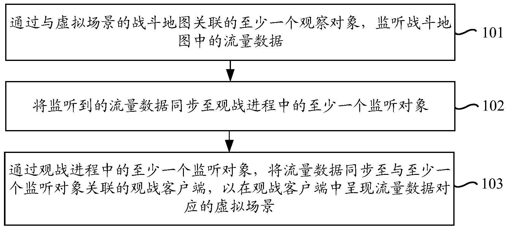 本申请提供了一种虚拟场景的流量处理方法、装置、电子设备及计算机可读存储介质;方法包括:通过与虚拟场景的战斗地图关联的至少一个观察对象,监听战斗地图中的流量数据;其中,运行虚拟场景的进程包括战斗进程以及区别于战斗进程的观战进程,战斗进程运行有战斗地图;将监听到的流量数据同步至观战进程中的至少一个监听对象;通过观战进程中的至少一个监听对象,将流量数据同步至与至少一个监听对象关联的观战客户端,以在观战客户端中呈现流量数据对应的虚拟场景。通过本申请,提高战斗进程以及观战进程的稳定性。