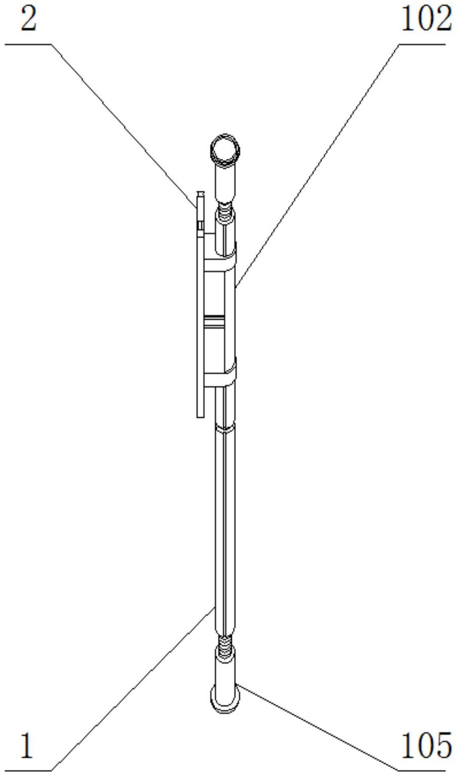 本实用新型公开了一种墙纸铺贴校准装置,涉及墙纸铺贴领域。本实用新型所述的一种墙纸铺贴校准装置,通过设置的可调节支架包括底杆、上杆、限位滑动槽、螺纹杆、底座和防滑垫,在使用时首先将底杆和上杆进行连接,在使用时可以适用与不同高度的墙体,并保证校准装置使用的稳定性和直立性,通过设置的调节挡板包括上滑动环、下滑动环、连接板、水平尺、限位板、伸缩板和橡胶垫,在使用时可以对墙纸的铺贴位置进行限制,并在限制在避免墙纸校准时对墙面造成划伤,此设备不但结构简单,而且操作方便,带来更好的使用前景。