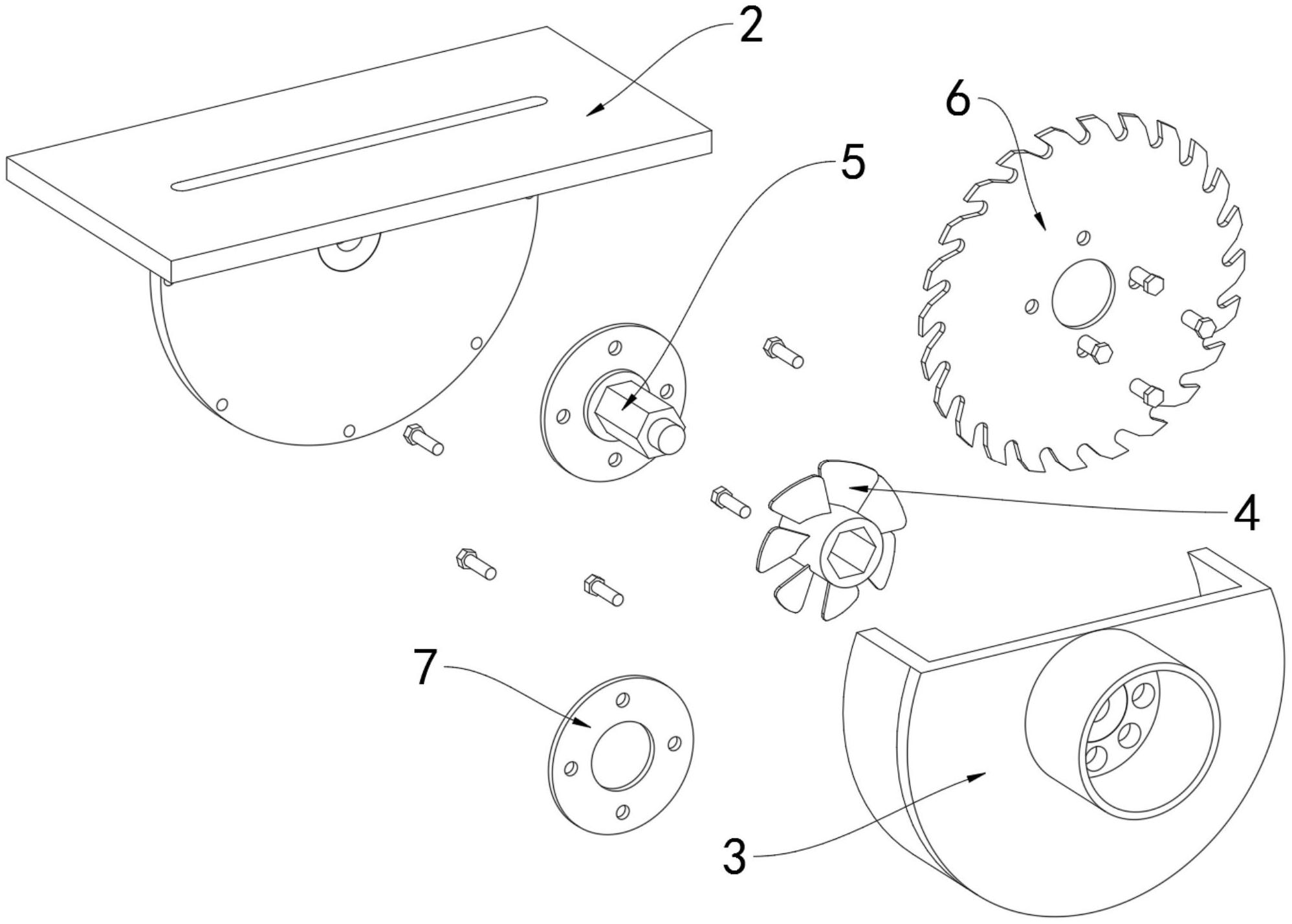 本实用新型提供一种柜门切割成型用吸尘机,包括装置本体,所述装置本体顶部设置有左右方向的承载固定板,且承载固定板底部优弧立板圆心前方通过轴承固定安装有前后方向的承载转动轴;所述承载转动轴中间套装并通过四处螺栓固定安装有环形压紧板,且环形压紧板和承载转动轴之间通过螺栓限位安装有加工切割锯;所述承载转动轴前方限位套装安装有吸尘同步扇,且承载转动轴前方端部通过轴承固定安装有防护出尘罩。防护出尘罩的设置,方便通过螺栓固定安装在承载固定板底部对加工切割锯底部裸露锯片进行防护,方便与承载固定板配合形成吸尘腔将切割过程中产生的碎屑粉尘吸入,解决了碎屑粉尘危害操作人员身体健康的问题。