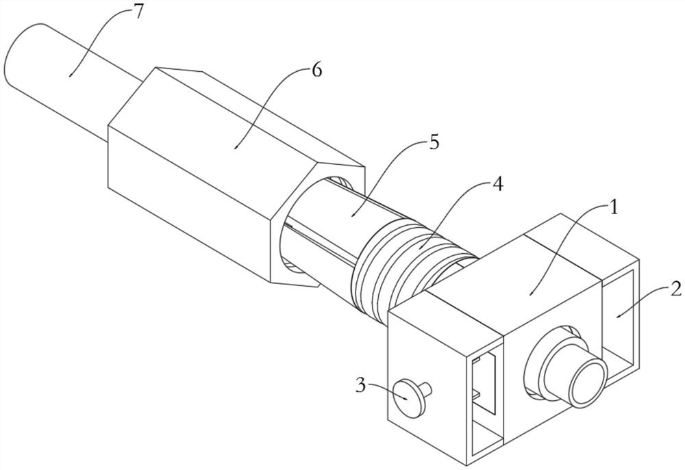 本实用新型提供一种基于木柜加工的气动高频钉角机的管道连接结构,包括固定块;所述固定块内部设有一个前后方向的贯穿孔,固定块内部还设有一个左右方向的轨道孔,气管卡接在贯穿孔内部,轨道孔内部设有固定机构;第一U型块,所述第一U型块对称设有两组并与固定块固定连接,第一U型块外表面设有一个螺纹孔;锁紧套,所述锁紧套外表为六棱柱结构。本实用新型中,通过锁紧套内部后端为倾斜结构的设置,使得锁紧套套接在连接管外部的时候,锁紧套对连接管末端的四组弹性夹板进行挤压,从而能够对气管进行进一步的固定,可以避免工人操作中误碰到气管之后,造成气管连接口松动的现象。