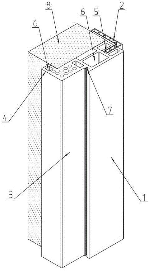 本实用新型涉及一种门套线条一体化结构,包括门套和门套线,所述门套一侧设有与门套一体成型的“L”形的卡接部,所述卡接部的外侧具有卡爪,所述卡爪连接于墙体上,门套另一侧沿门套长度方向开有伸缩槽;所述门套线的一端嵌于所述伸缩槽内,门套线另一端连接于墙体上。采用高分子材料通过模具经高温挤压而成,能够定制不同尺寸规格的门套,避免了材料的浪费。并且一边与线条结合减少了线条调节的范围,安装过程简单快捷,能够直接适用于大多数门套的安装。材料具有防水性,可用于各种潮湿、盐雾环境中,并且不含甲醛、VOC有机挥发成分。门套线条一体化结构,根据砌块结构固定几种规格批量生产,减少安装麻烦,减少线条的匹配,提高劳动效率。