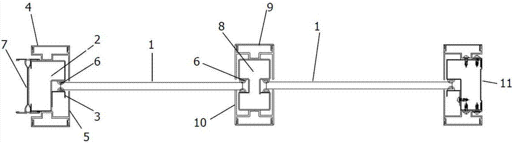 一种可拆装单玻内钢外铝隔断墙结构,包括玻璃和用于固定玻璃的钢制玻璃槽组件,其特征在于:所述钢制玻璃槽组件为单边钢制玻璃槽组件和双边钢制玻璃槽组件,所述单边钢制玻璃槽组件包括单边钢制玻璃槽、单边钢制玻璃压条、单边铝外盖盖板、单边铝外盖、弧形胶条、工字龙骨、钢制龙骨;所述双边钢制玻璃槽组件包括双边钢制玻璃槽、弧形胶条、双边铝外盖、双边铝外盖盖板;玻璃用钢制玻璃压条固定,钢制玻璃压条与玻璃之间装有弧形胶条,最后钢制玻璃槽两端以铝型材料做外观收口处理。本实用新型提供的单玻内钢外铝隔断墙结构,不但高固定有隔音,具有一定防火功能,且外观多样,可拆装,易搬运。