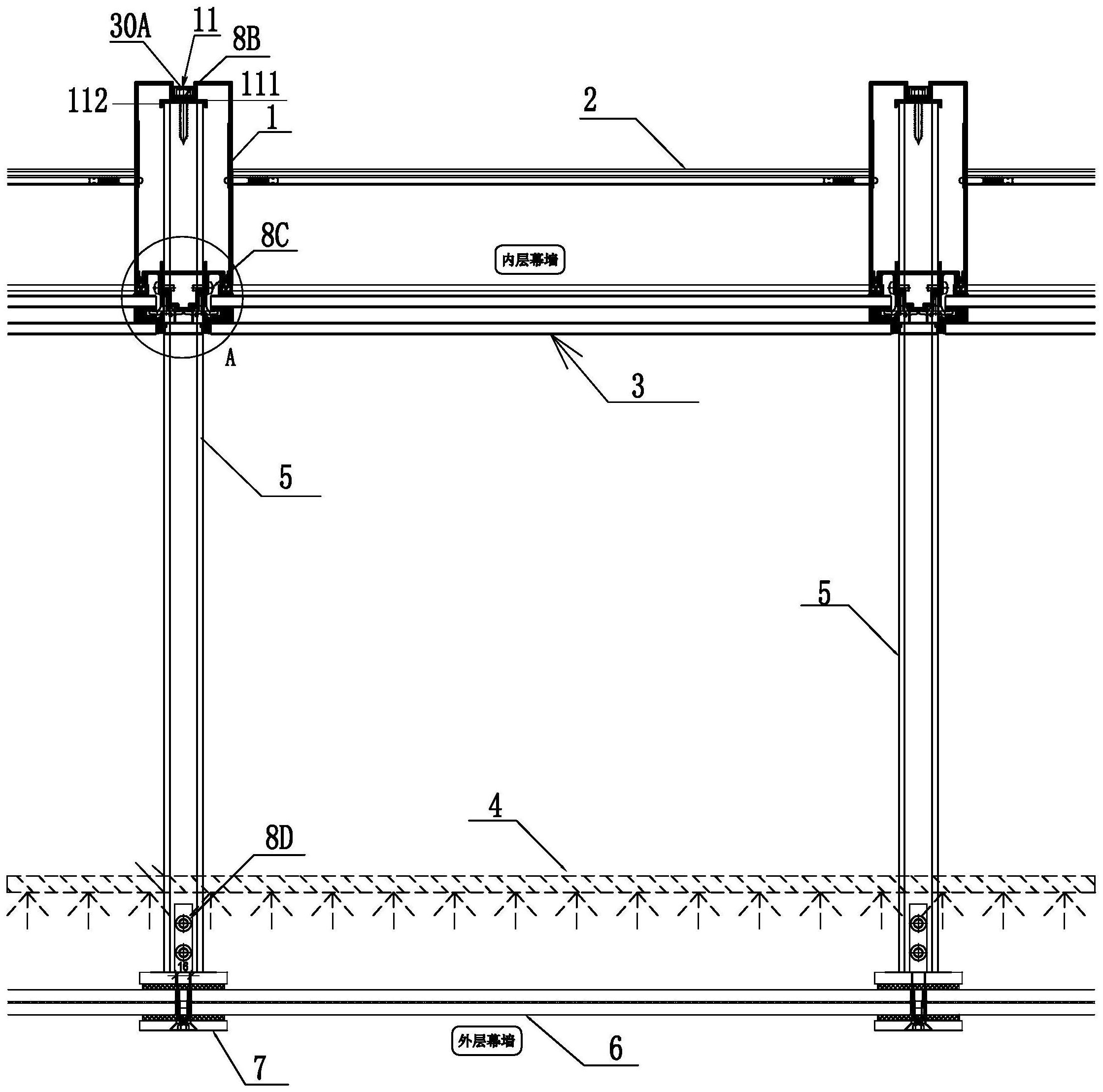 本发明公开了一种构件式点支撑发光屏双层幕墙系统,包括内层铝合金立柱、内层铝合金横梁、内层玻璃墙、发光屏、铝合金支臂和外层玻璃墙,该铝合金支臂的后端插固在该内层铝合金立柱的腔体中,该铝合金支臂的前端连接外层不锈钢支撑件,该外层玻璃墙的玻璃单元之间通过该外层不锈钢支撑件夹固。其外层幕墙无龙骨的设计使得外层幕墙对LED的遮挡降低到最小,提供了连续完整的屏幕效果。外层幕墙与支臂连接采用隐藏式的螺钉连接方式,提供了简洁视觉效果。铝合金龙骨与铝合金支臂工厂组装,外观整洁美观,LED屏呈现效果好,现场施工便捷,安全可靠,能提高安装效率,缩短工期,降低成本,提高经济效益。