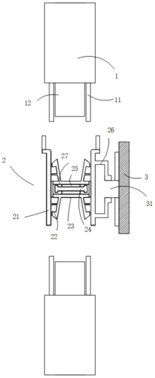 本实用新型公开了一种墙板连接结构,包括墙板、连接件以及墙体,连接件预安装固定在墙体上,连接件开设一个安装口供墙板插入安装;墙板靠近于连接件的端部设置有插入端,插入端的中部为板芯,板芯的两侧均间隔安装有防脱板;连接件由壳体围设出一个空腔,在空腔内固定安装有橡塑材料制成的夹持件,夹持件的中部设有供板芯插入的通槽,通槽的侧壁与壳体的内侧壁之间预留出间隙供防脱板插入。本实用新型的墙板安装结构,结构设计合理,特别是在安装上非常的方便,采用直插式安装,插入之后在夹持件的作用下,板芯与防脱板相互挤压,籍由橡塑材料的夹持件增大摩擦,以达到安装稳定的效果。