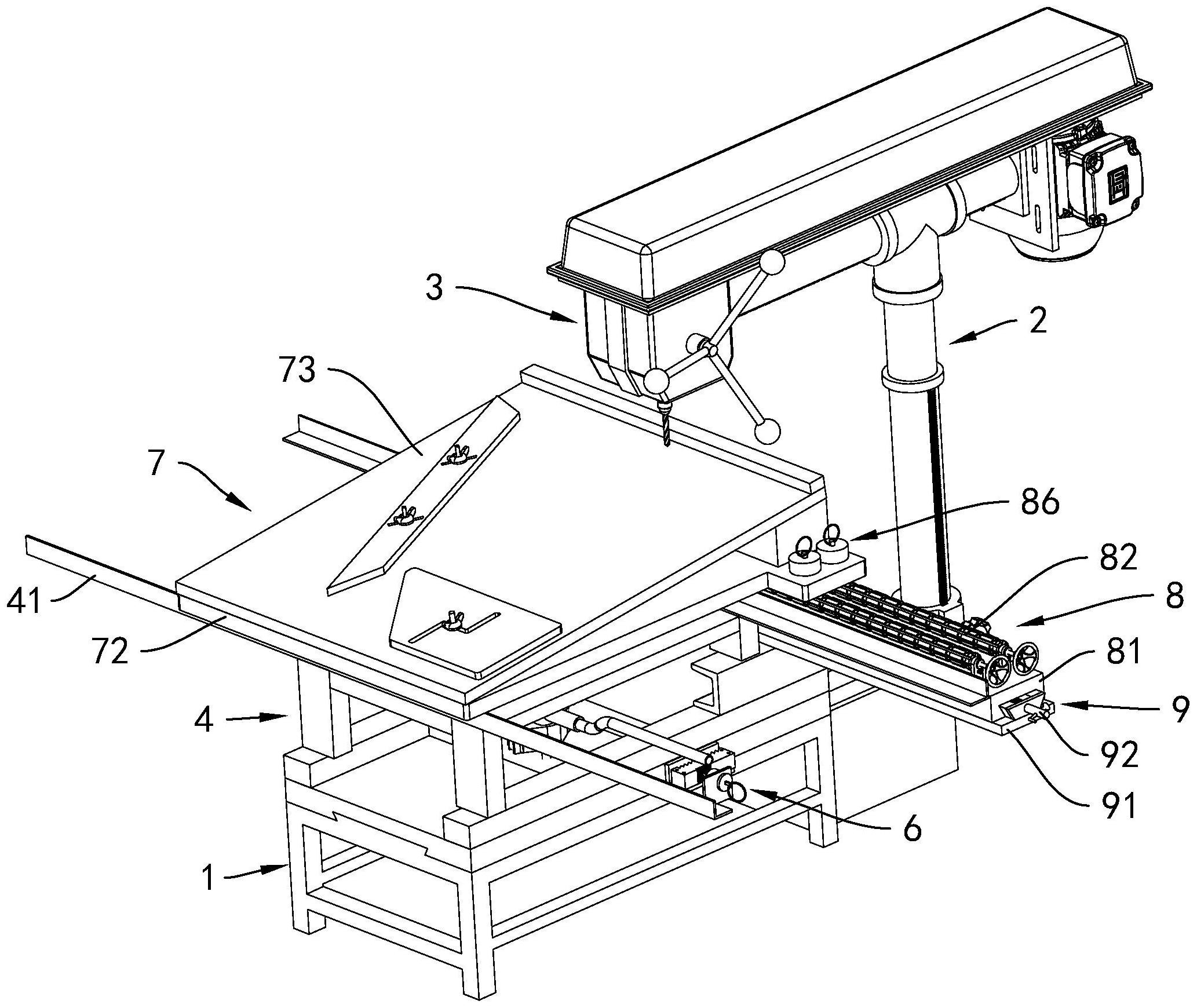 本申请涉及一种扬琴加工用钻孔装置,属于扬琴生产技术领域,包括支撑架、支撑柱以及主轴箱,主轴箱位于支撑柱的顶端,主轴箱和支撑架上下间隔相对,支撑架的顶端滑动连接有能够沿着X轴方向移动的X轴移动座;X轴移动座与支撑架之间设置有用于驱动X轴移动座的驱动组件;X轴移动座与支撑架之间还设置有用于限制X轴移动座每次移动点位距离的第一点位固定机构;X轴移动座的顶端滑动连接有能够沿着Y轴方向移动的Y轴移动座;X轴移动座与Y轴移动座之间设置有第二点位固定机构,第二点位固定机构用于限制Y轴移动座每次移动点位距离。本申请具有缩短扬琴加工时间,降低扬琴的生产成本的效果。