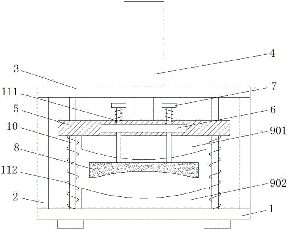 本实用新型涉及橡胶生产技术领域,尤其涉及一种橡胶生产用切胶装置,包括底座,所述底座上端面的两侧焊接有支柱和顶板,顶板上端面的中部通过螺钉安装固定有液压伸缩杆,液压伸缩杆伸缩部的下端面焊接有挤压板,挤压板的两侧均焊接有侧板,侧板上对称开设有通孔,且通孔内滑插设置有T形杆,挤压板的下端面设有上切刀,底座上端面的中部设有下切刀,挤压板的两侧对称开设有通孔,且通孔内均滑插设有限位杆。本实用新型中,此橡胶生产用切胶装置在使用时,提高了生产效率,很好的满足了人们的日常使用需求。