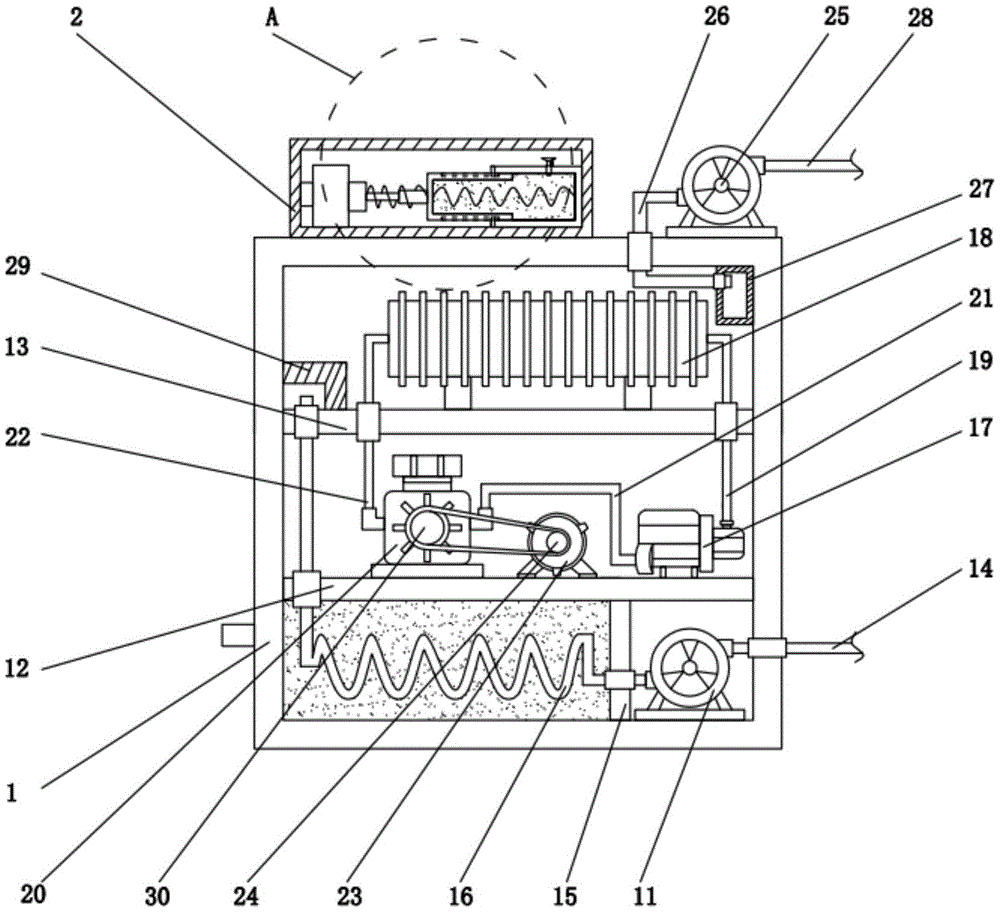 本实用新型提供一种专用臭氧变压器控制装置。所述专用臭氧变压器控制装置,包括降温箱,所述降温箱顶部的左侧设置有控制箱,所述控制箱内壁底部的右侧固定连接有固定管,所述固定管左侧的顶部和底部均固定连接有卡块,所述固定管的左侧设置有移动管,所述移动管的顶部和底部均开设有滑槽,所述移动管内壁的左侧与固定管内壁的右侧之间固定连接有伸缩弹簧。本实用新型提供一种专用臭氧变压器控制装置设置有可以根据变压器内温度改变而自动启动或者关闭的控制箱,当变压器温度较高时,装置能够通过移动管启动整个装置,本装置自动化程度高且对变压器的温度控制效果良好。