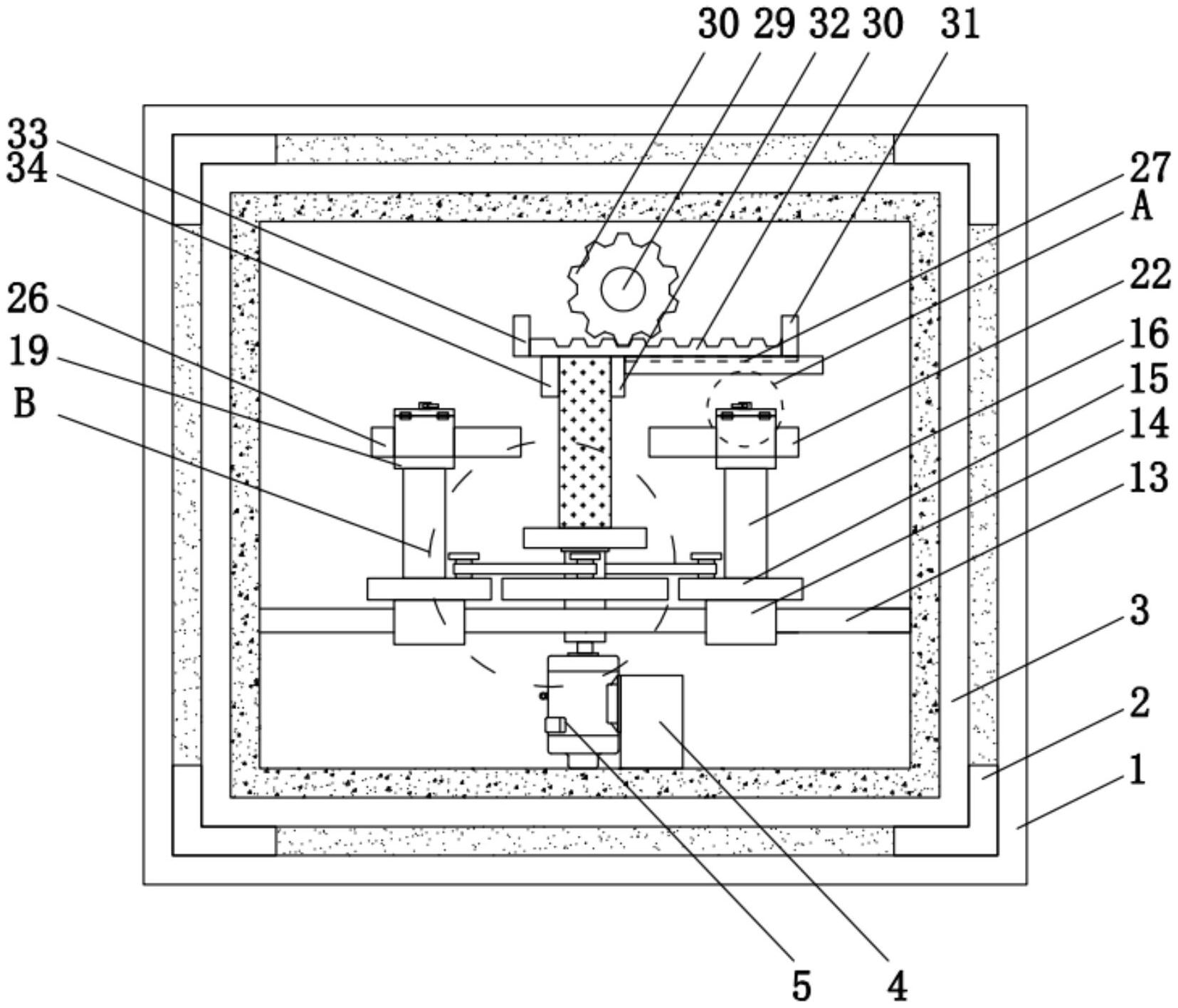 本实用新型提供一种防击穿水处理臭氧发生器。所述防击穿水处理臭氧发生器包括箱体和圆杆,所述箱体内壁的两侧均固定连接有阻隔板,两个所述阻隔板的相对一侧之间设置有运作箱,所述运作箱内壁的底部固定连接有固定座,所述固定座的一侧设置有传动电机,所述传动电机的输出轴设置有转杆,所述运作箱内壁的后侧固定连接有木板。本实用新型提供的防击穿水处理臭氧发生器,以根据不同场合所需要介电质对其进行更换,减少产品使用的限制性,可以根据自己所需要的产生臭氧的速度控制两个相反电极的的距离,增加了机器使用的灵活性,可以根据自己的需求确定机器运行使用的阳极与阴极物质,提高效率,减少时间的浪费,可以进行防潮,防止对机器造成损害。