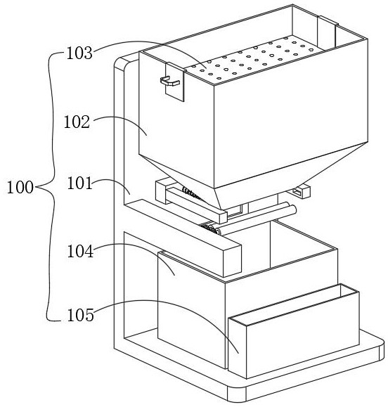 本实用新型公开了一种生产高纯氢氧化镁用除杂装置,包括机体、吸附机构和清理机构,所述机体包括支架、固接于支架端面的储料箱以及置于支架上并位于储料箱下方的接料盒,吸附机构包括设置于储料箱下方一侧的负重板、固装于负重板上的马达、可转动安装于负重板上的传动轴、套装于马达输出端和传动轴上并啮合传动的齿轮、固接于马达输出端和传动轴端部的吸附套以及固装于吸附套内的电磁铁,所述吸附套位于储料箱出料口的下方,所述清理机构位于支架上,用于清理吸附套上的磁性废屑,通过设置吸附机构,电磁铁通过吸附套将物料中的磁性废屑进行吸附,且吸附套转动的时候,可以将物料分开,有利于提高吸附的效果。