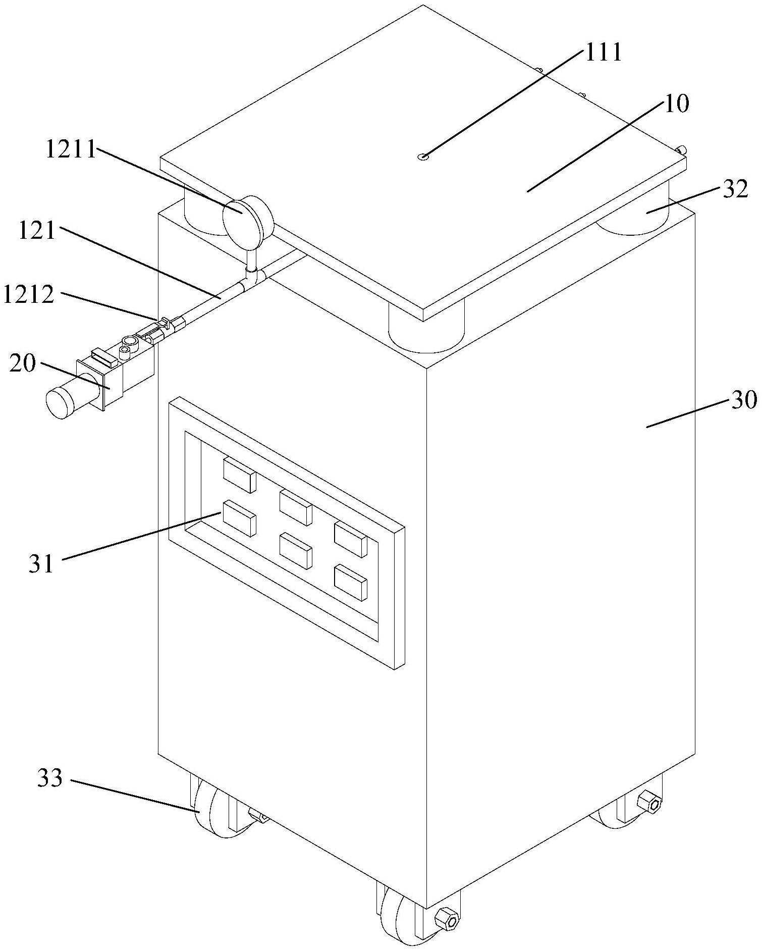 本实用新型提供了一种密封性检测装置,其包括加热板、真空泵和控制柜,加热板具有相对设置的检测面和安装面,检测面被配置为与待检测部件连接形成封闭空间,安装面上连接有连接管,连接管上设有真空表,检测面上设有通气孔,且连接管通过通气孔与连接管相连通;真空泵连接于连接管的自由端;控制柜设置于加热板的一侧并与加热板电连接,控制柜被配置为调节加热板的温度。本实用新型的密封性检测装置,使得真空表既能够通过连接管实时检测封闭空间内的真空度,又远离加热源(加热板),从而不会长期处于被加热状态,有效降低了真空表因长期处于被加热的状态导致老化的几率,进而保证了密封性检测装置的测试准确性。