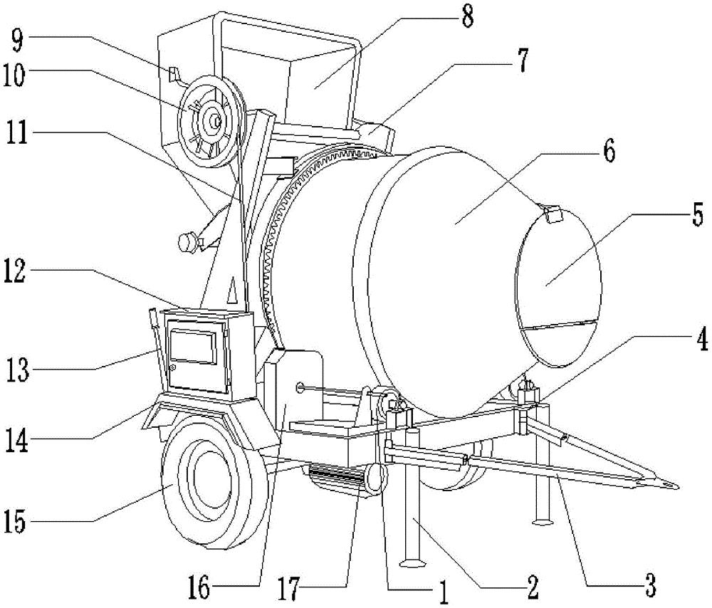 本实用新型属于建筑设备技术领域,尤其涉及一种具有降噪功能的高效混凝土搅拌机。本实用新型要解决的技术问题是提供一种具有降噪功能的高效混凝土搅拌机,一种具有降噪功能的高效混凝土搅拌机,包括有传动机构、搅拌机承重架、搅拌筒、料斗固定架、搅拌机料斗、吊轮、操作箱、操作手杆、减速器、发动机、驱动齿圈、可拆卸推手装置、降噪安全装置,可拆卸推手装置包括有推手杆、挂钩、挂环、固定推手杆和推手固定连接部件,降噪安全装置包括有消声棉、出料口活动盖板、活动铰接件、盖板和铰链,本实用新型达到了具有具有降噪功能,防止物料飞出,卸料便捷,且高效的有益效果。