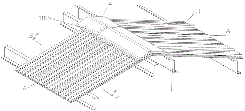 本实用新型公开一种用于水池屋面系统的采光屋顶结构,包括多根支撑檩条和设置在支撑檩条上的采光屋顶,所述采光屋顶整体呈中间拱起的对称形屋脊结构,所述采光屋顶由多块屋面板顺次对接而成,在屋面板上开设有多个采光口和换气扇洞口,在屋面板之间的屋脊对接缝处的上下两侧分别设置有上泛水板和下泛水板,在屋脊处的间隙处设置有聚氨酯浇灌层,上泛水板的主体安装在聚氨酯浇灌层上方,上泛水板的两侧连接部通过拉铆钉固定,在上泛水板的边缘处设置有向下弯曲的压接部与屋面板贴合,在压接部外侧连接缝设置有钢屋面防水层;本装置具有结构简单,密封性好,能够有效地防止雨水的倒灌渗入等优点。