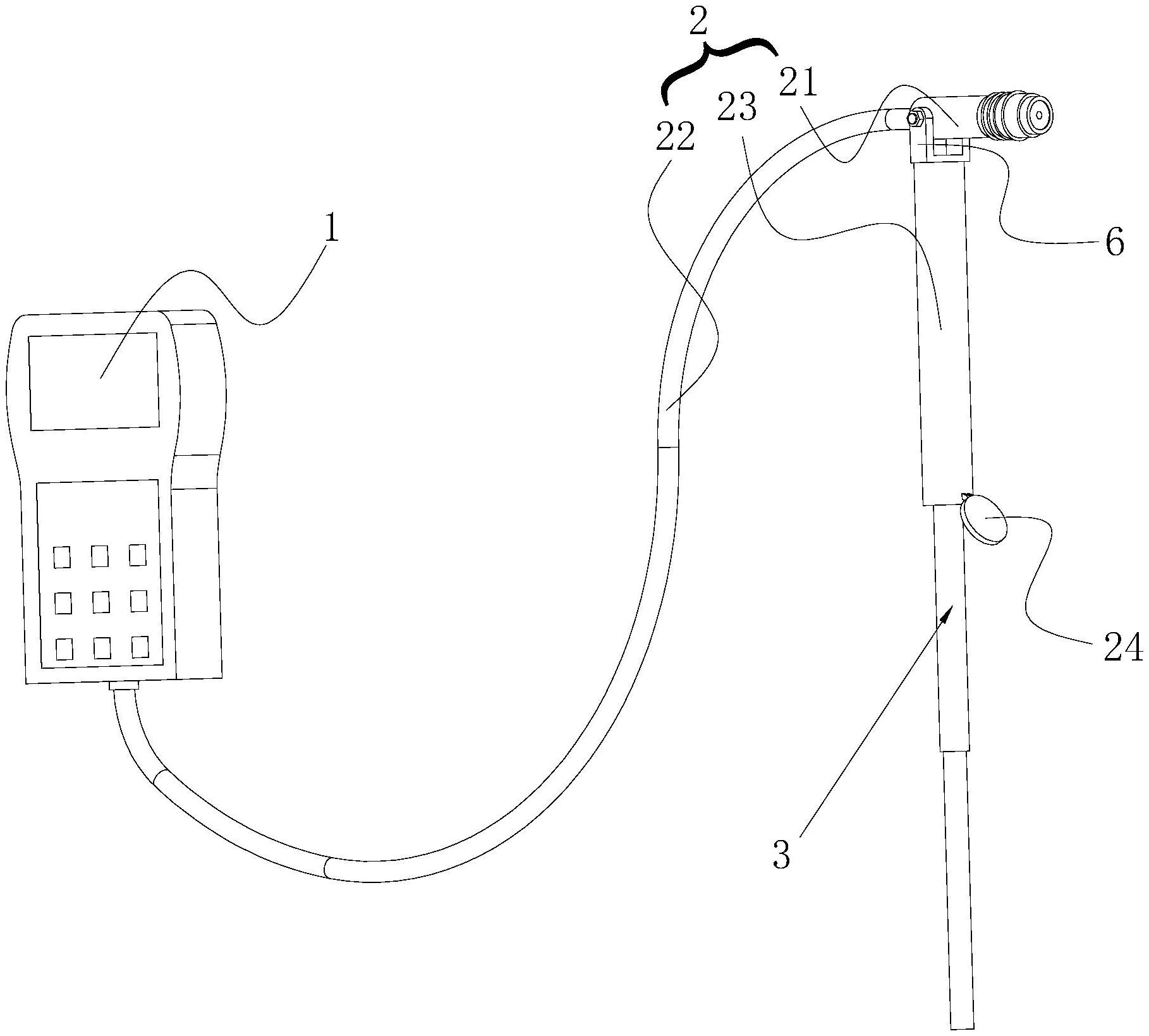本申请涉及一种涂层测厚仪,其包括机体以及探测装置,探测装置包括导线以及探测头,机体与探测装置通过导线连接,探测头安装有伸缩杆,伸缩杆的一端与探测装置固定连接,伸缩杆远离探测装置的一端可朝靠近或远离探测装置的方向滑动。本申请具有工作人员操作伸缩杆使得伸缩杆伸长,将探测头伸入较狭窄空间内或伸至较高位置的覆层;通过刚性的伸缩杆与探测头连接,使得工作人员可操作伸缩杆使得探测头升至较高位置处,而且伸缩杆相对于人体较易进入到狭窄空间内;进而使得涂层测厚仪的适用范围较广的效果。