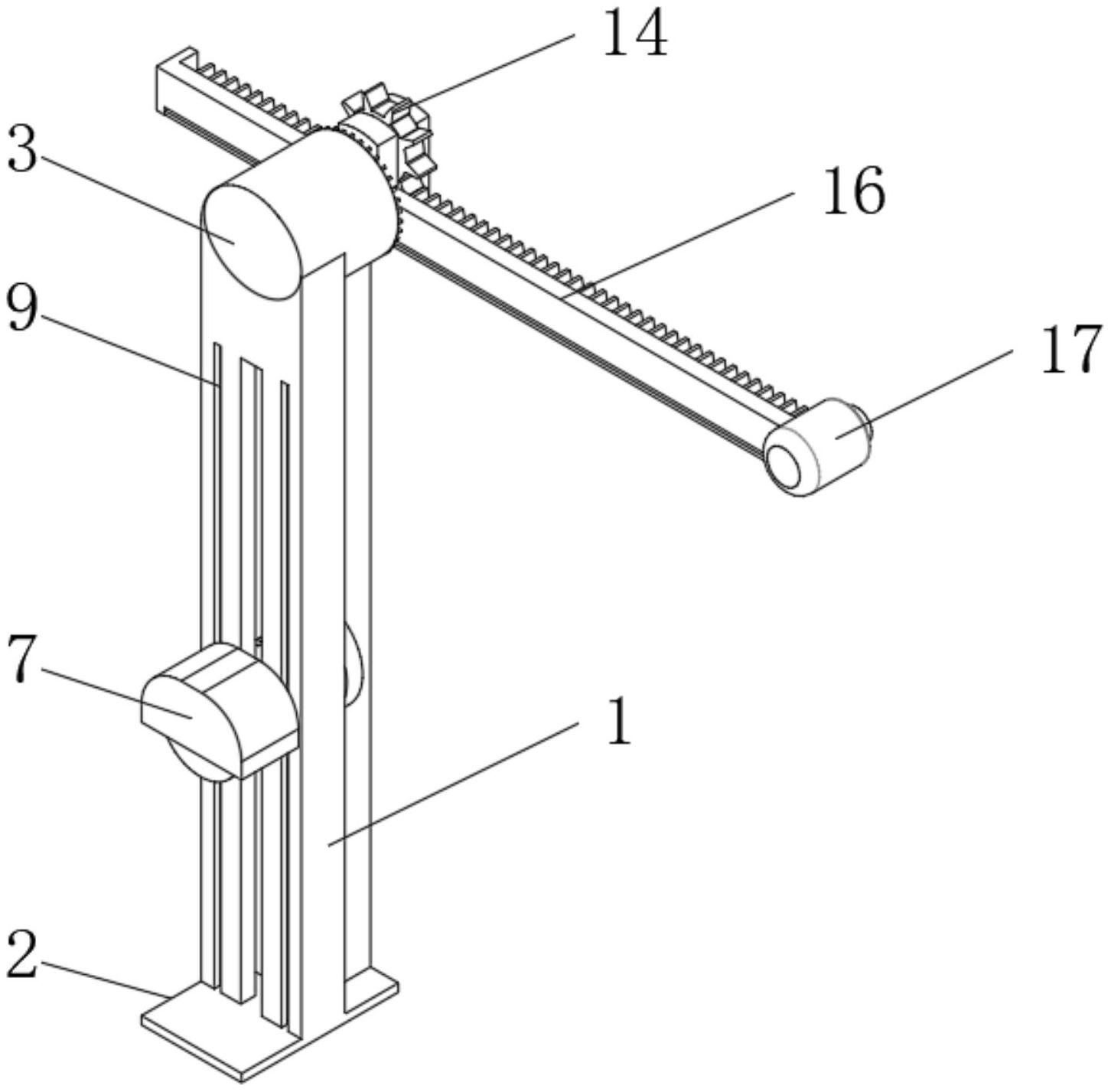 一种检测玻璃表面平整度的激光干涉仪,包括立柱,所述立柱的底面连接有底板,所述立柱的顶面连接有圆柱,所述立柱的内部贯穿开设有导向槽,所述导向槽的内壁表面设置有齿条,所述齿条上啮合安装有齿轮,所述齿轮一侧的立柱表面活动安装有压轮,所述齿轮另一侧的立柱表面固定连接有调节盘,所述圆柱靠近限位柱的一端表面设置有刻度盘,所述U形键的内部转动连接有调节轮,所述调节轮下方的U形键内部开设有限位槽,所述限位槽的内部滑动连接有齿杆,所述齿杆的一端固定连接有激光检测头。本实用新型中立柱的两侧表面粗糙度低于0.05µm,便于手持作为直尺检测玻璃表面平整度,激光检测头可利用光的折射原理检测玻璃表面平整度。