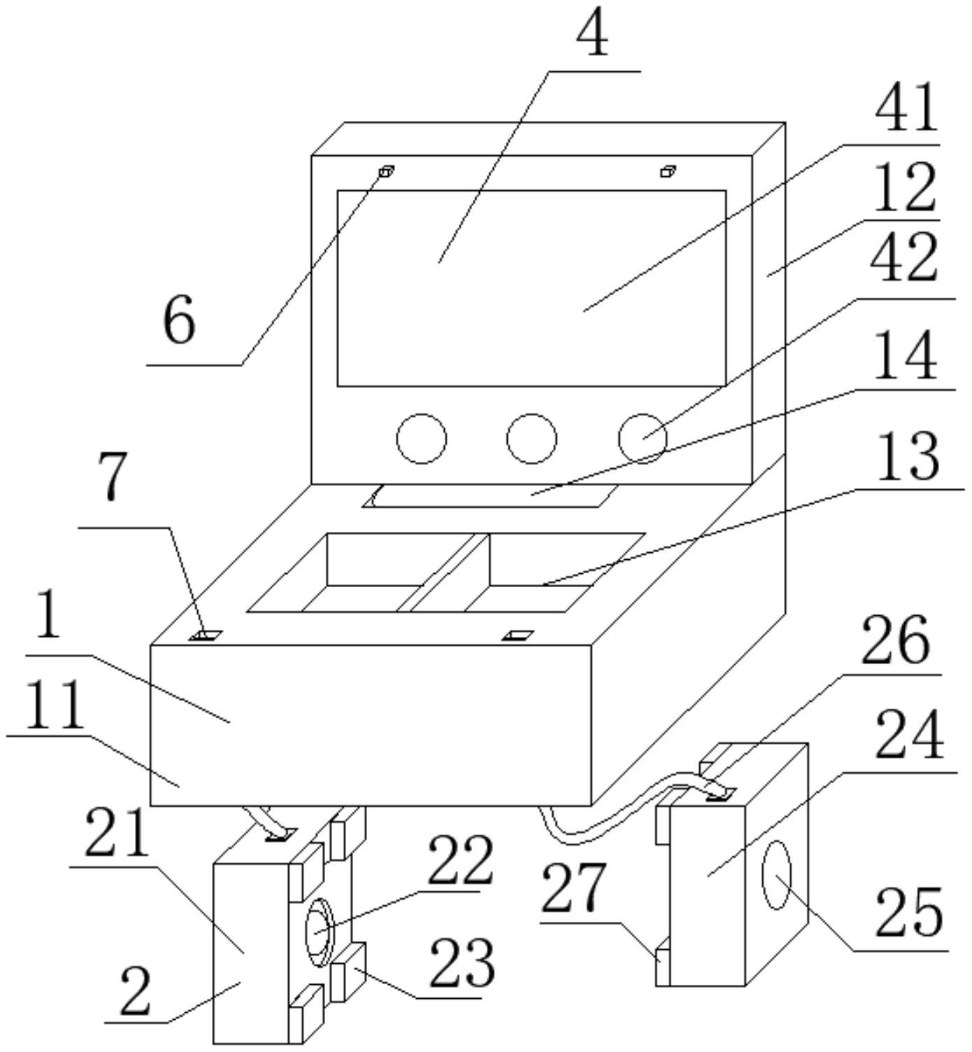 本实用新型公开了一种分体式透光率仪,包括仪器收纳装置,仪器收纳装置的内部设置有起到检测透光率效果的透光率检测装置,仪器收纳装置的内部固定连接有起到显示及控制仪器效果的控制显示装置,仪器收纳装置的内部设置有起到卡接效果的卡槽,卡槽的内部卡接有起到固定效果的卡扣,仪器收纳装置的底端滑动连接有起到对仪器固定效果的夹持装置,仪器收纳装置的底端固定连接有起到对收线效果的收线装置;本实用新型中,仪器采用分体设计,使其在检测时对于某些物品可以做到更好的检测,提高仪器的适用性,并且设置了仪器收纳装置与收线装置,使其方便收纳,起到对透光率检测装置的保护效果,提高了设备的使用寿命。